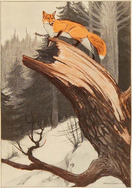 Another time I was in an opening of the big woods at dusk of a winter day when a red fox appeared, carrying a rabbit. Evidently he had eaten as much as he wanted of the sweet meat, and was seeking a place to bury the remainder against a time of need. How cautious he was! How mindful of hungry noses that would be questing the woods before daybreak! He went hither and yon in a most aimless way, apparently; but one who watched him might know that he was leaving a merry tangle of tracks for any nose that should attempt to follow them. After hesitating over many spots he dropped the rabbit beside a rock, threw some snow over it, and went away with such confidence that he never once turned round. As he disappeared in the dusky woods the top of a stub under which he passed seemed to move, to bend forward as if alive. And it was alive; for a horned owl was sitting up there on his watchtower, making himself so inconspicuous[301] that no one noticed him. No sooner was the fox gone than the owl swooped to the cache, drove his claws into it, and glided away like a shadow, taking the rabbit with him.