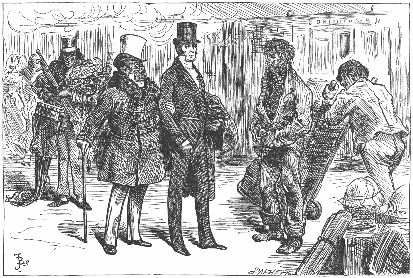 Aldus op den drempel gestuit, terwijl hij achter zijne vrouw de kamer wilde uitgaan, keerde Toodle zich om en bleef voor Dombey staan. Hij was een forsch, onbehouwen man, met ronde schouders en een ongepolijst voorkomen, wien de kleederen als aan het lijf waren gesmeten, ruim van haren en baard voorzien, welker kleur misschien door rook en kolenstof wat donkerder was geworden, met harde knokkige handen, en een voorhoofd zoo ruw als de schors van een eik. In alle opzichten vormde hij een volmaakt contrast met Dombey, een van die glad geschoren en kort geknipte rijke heeren, die zoo glad en krakig zijn als de nieuwe banknoten, en wier zenuwen kunstmatig opgespannen schijnen te zijn door de prikkelende werking van gouden stortbaden.