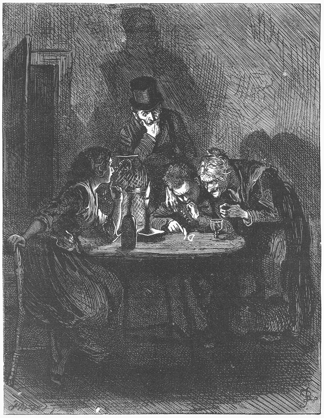 “Dit is zijne vrouw, gelijk van zelf spreekt,” zeide jufvrouw Tox, naar de jonge vrouw met het kindje wijzende. “Hoe vaart ge, Polly?”—“Tamelijk wel, mevrouw! dankje,” was het antwoord. Met oogmerk om de vrouw gunstig te doen uitkomen, had jufvrouw Tox hare vraag gedaan alsof zij inderdaad eene oude kennis, die zij in een poosje niet gezien had, naar haar welstand vroeg.—“Dat verheugt mij inderdaad,” zeide jufvrouw Tox. “Dat meisje is hare zuster, ongetrouwd, die bij haar woont, en op hare kinderen zou passen. Zij heet Jemima. Hoe vaart ge, Jemima?”—“Dankje, mevrouw! heel wel.”—“Dat verheugt me. Ik hoop dat het zoo met u blijven zal.—Vijf kinderen. Het jongste is zes weken. Die aardige kleine jongen, met een blaar op zijn neus, is de oudste. Die blaar, geloof ik,” vervolgde jufvrouw Tox, de familie rondom aanziende, “is zeker niet erfelijk, maar iets toevalligs.”—“Strijkijzer,” hoorde men den man brommen.—“Neem mij niet kwalijk, mijnheer!” zeide jufvrouw Tox; “ge zegt?”—“Strijkijzer,” herhaalde hij.—“O ja,” zeide jufvrouw Tox. “Dat is waar. Ik had het vergeten. De kleine jongen heeft, terwijl zijne moeder er niet bij was, aan een heet strijkijzer willen ruiken. Gij hebt gelijk, mijnheer! Toen wij bij de deur kwamen, waart gij juist zoo goed om uw beroep te willen zeggen, namelijk.…?”—“Stoker,” antwoordde de man.—“Wat?” vroeg Tox, verwonderd.—“Stoker. Stoommachine.”—“O ja!” zeide jufvrouw Tox, hem peinzend aanziende, zonder, naar het scheen, nog recht te begrijpen, wat hij bedoelde. “En hoe bevalt het u, mijnheer?”—“Wat, mevrouw?”—“Dat; uw beroep?”—“O, tamelijk wel, mevrouw! De asch vliegt hier wel eens wat in,” zeide de man, naar zijne borst wijzende, “en dan spreekt iemand schor, zooals ik doe. Maar het is maar asch, mevrouw! geen grommigheid.”