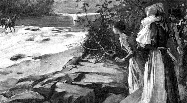 Her eyes mechanically followed his to the purple slope so still under the crimson sky. Higher up, the mountain, shielded by the shadow of its own crags from this reflection of the west, showed a dark-green shade of an indescribable depth and richness of tone, never merging into dusky indefiniteness. Through a gap in the range to the east were visible the infinite blue distances of the Great Smoky peaks, their color here and there idealized by the far-away glamours of sunset to an exquisite roseate hue, or a crystalline and perfect amethyst against the amber horizon. Down the clifty gorge—its walls of solid sandstone, cloven to the bare heart of the range by the fierce momentum of the waters—the bounding river came. One mad leap presented the glittering splendors of a glassy-green cataract, and in its elastic spray an elusive rainbow lurked. Its voice was like that of one crying in the wilderness, so far might its eloquent iteration be heard. The Little People, in their day, might have given ear to its message and pondered on the untranslated tidings, but now they did not heed.