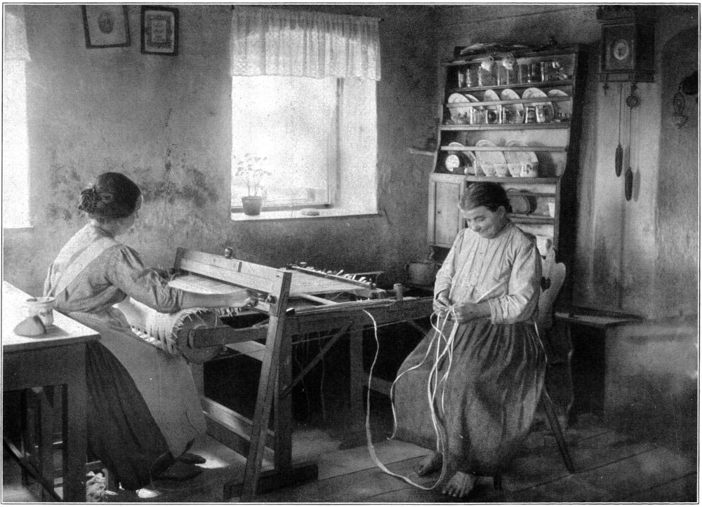 Seit Jahresfrist steht der Bastwebstuhl im Hause. Mit sicherem Griff hängt die Linke den Basthalm an den Zugstab, den die Rechte in ruhiger Bewegung durch gespannte Halme zieht und Breite um Breite mit gleichmäßigem Zug zur Decke fügt. Nimmerrastende Hand fordert der Webstuhl von früh bis spät abends, ehe er neun Kronen (eine Mark) zum Taglohn gibt. Die runzeligen Hände der Alten flechten zitternd Streifen um Streifen zum »Elfhalm« und »Siebenhalm«, das Meter um Bruchteile eines Pfennigs.