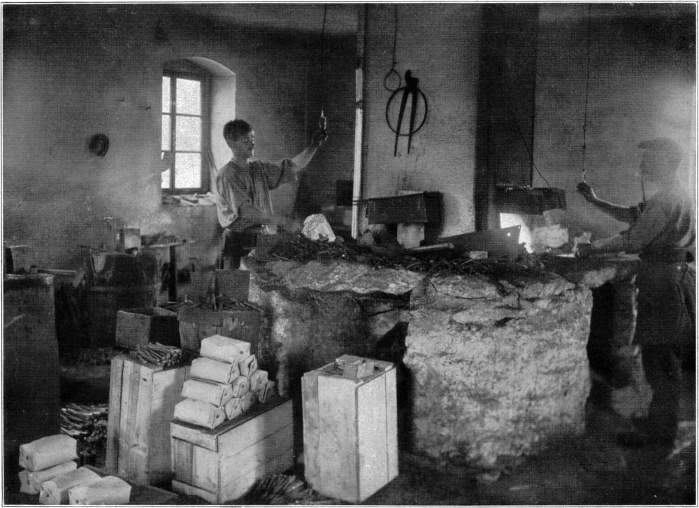 Überkommenes Stiltum ist mit neuem Stilverständnis erhalten und gepflegt. Die Baumeister von 1834 haben mit köstlicher Festigkeit gebaut. Wenn man die Mauern des Schokoladenwerkes sieht, in die zwei Kraftmeier[75] von heute ihre Brüste hineinstemmen könnten, so durchfährt einen Freude: Gott, muß das warm sein hier im Winter! Die Fabrik ist mit schlichter Farbeneinstimmung ausgemalt; Kontor und Werkräume sind in stillen Farben gehalten. Aber durchgängig bewegt man sich eben nicht in Fabriknüchternheit, sondern in bäuerlicher Breite und Behaglichkeit. Und dabei herrscht doch Zwecksinn. Die Verarbeitung ist so geregelt, daß die Rohstoffe mit Fahrstuhl in das oberste Stockwerk gefahren und von da, je nach dem Fortschreiten der Behandlung, Stockwerk um Stockwerk tiefer gefiltert werden. Es geht alles durch Falltrichter; Menschen brauchen sich nicht abzuhetzen.