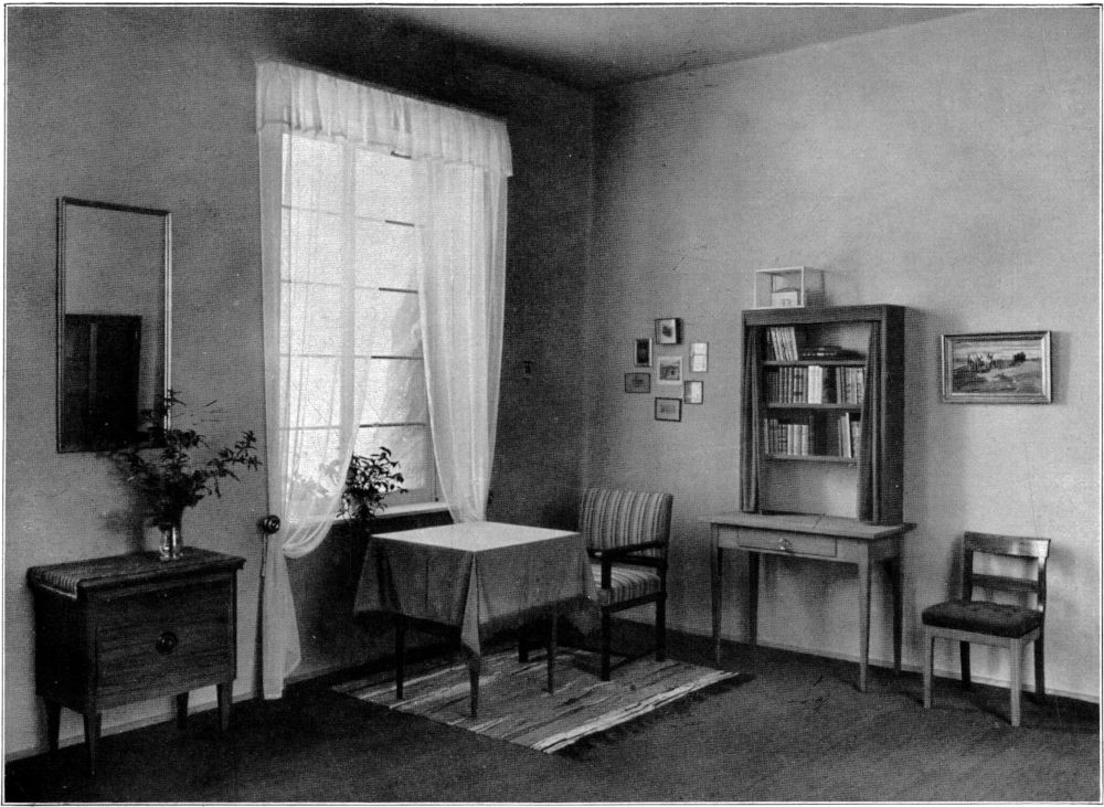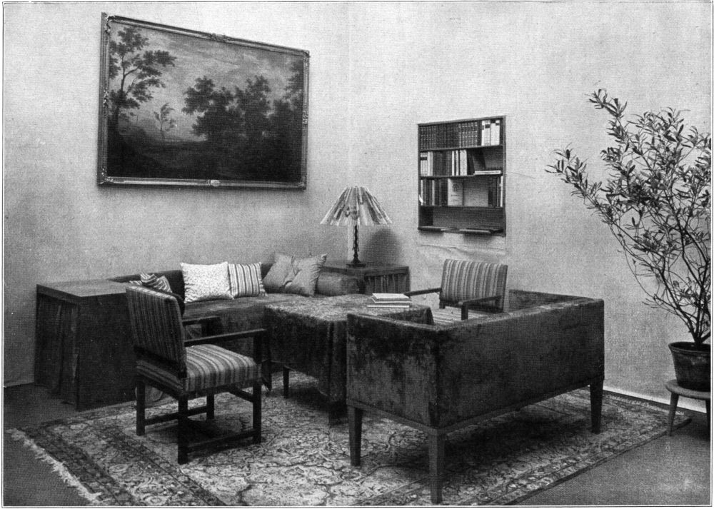 Der Landesverein Sächsischer Heimatschutz hatte nun, um diese wichtigen Fragen klären zu helfen, eine Anzahl Zimmer ausgestellt, die in seinem Auftrage Professor Dr. h. c. Heinrich Tessenow entworfen hatte, und die in den[67] Deutschen Werkstätten, Dresden-Hellerau, ausgeführt worden waren. Es erscheint hier überflüssig, auf die Eigenart Tessenows einzugehen. Er ist Architekt und nicht Kunstgewerbler. Er ist Architekt, der im Handwerklichen wurzelt.