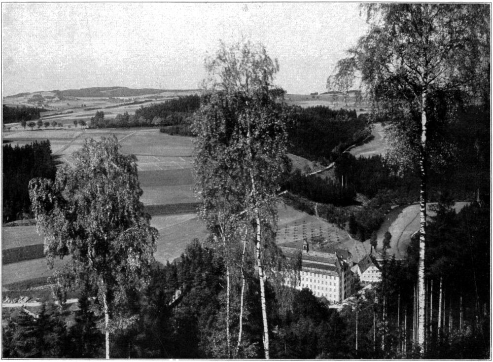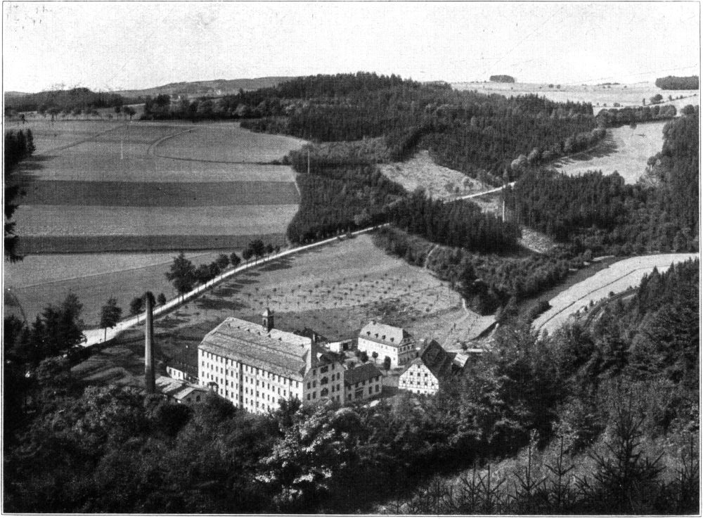 Es ist eine Fläche von achtzigtausend Quadratmetern, die durch das Anwesen Himmelmühle umspannt wird. Wenn man hinzunimmt, daß insgesamt einhundertundzwanzig Seelen darauf wohnen, so findet man die stattliche Zahl der Gebäude nicht verwunderlich. Sie scheiden sich durch den Vorgarten des Herrenhauses und werden an beiden Enden des Raumes durch je eine Brücke über die Zschopau abgeschlossen. Auf unserem Fußwege gelangen wir gerade auf den Fabrikplatz zu. Mit breiter Front steht das »Schokoladenwerk Himmelmühle« links vor uns. Es ist ein Bau von acht Stockwerken und 17 Metern Tiefe; auf dem spitz zulaufenden Schieferdach sitzt ein Türmchen; die Bauweise ist ländlich; das Haus überragt wohl die Nebengebäude, bringt aber nicht etwa den Eindruck eines amerikanischen Riesen hervor. Drei von den Stockwerken sind nämlich in die zweifach gebrochene Dachlinie aufgenommen. Vor dem Schokoladenwerk liegt das Kesselhaus mit dem Schornstein. Rechts, nach dem Ufer der Zschopau zu, schließt das Herrenhaus an, ein Gebäude mit flachem Dach, und insofern herausgehoben aus der Zahl der übrigen. Schmuckwerk fehlt auch hier; die Bauten wirken insgesamt nur durch die Schönheit ihrer Sachlichkeit. Zwischen Herrenhaus und Fabrik hindurch kommt man auf einen viereckigen Platz, den drei erzgebirgische Fachwerkbauten, das Lange Haus[6], das Kurze Haus und das ehemalige Schulhaus umgeben; damit hat man nach der einen Seite zu das Ende erreicht. Man wendet also, geht am Vorgarten des Herrenhauses und einem hübschen Pavillon in seiner entferntesten[72] Ecke vorüber und kommt nach einem Weilchen zu der anderen Gebäudegruppe zschopauabwärts, der das Gasthaus Himmelmühle, ein Landwirtschaftsgebäude und ein Beamtenwohnhaus des Kraftwerkes Westsachsen, zugehören. Dahinter sieht man noch einen Wiesenrücken, der, wie am entgegengesetzten Ende, mit Obstbäumen bepflanzt ist; zur Höhe hinauf gewahrt man die viel begangene Talstraße, ein Notstandswerk aus den Jahren 1923 und 1924, dem die Ergänzung nach Wolkenstein heute noch fehlt.