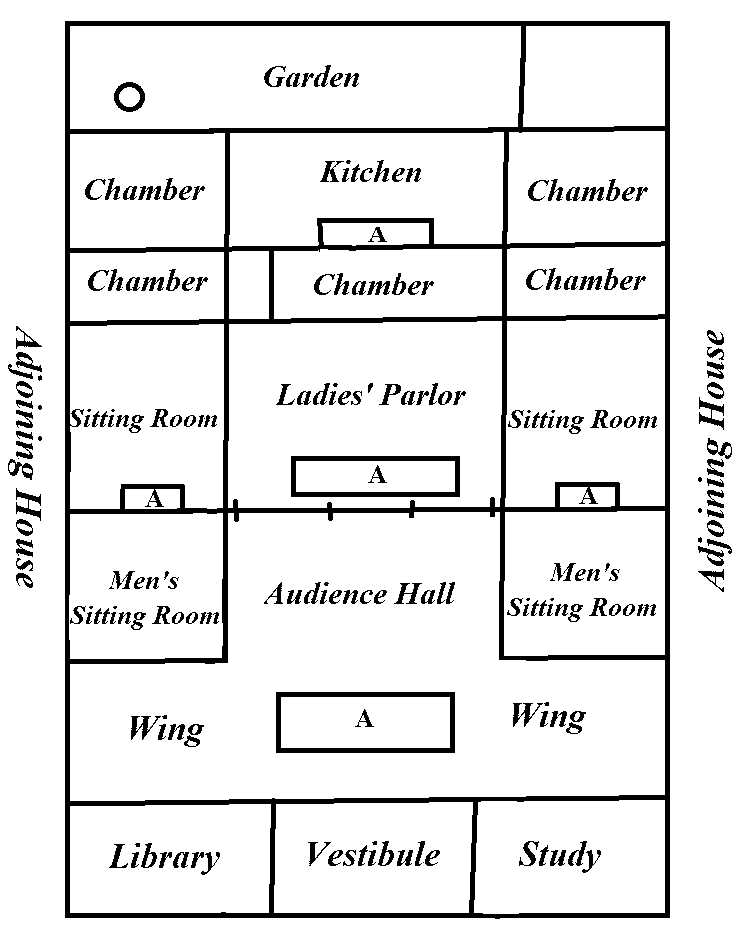 If you examine the plan, you will see that there is only one regular entrance to the house. Having passed the door, you will be in the vestibule which opens on the large compluvium by three pairs of doors, all of which are thrown ajar on grand occasions; but ordinarily only a side pair are left open. Having passed them and descended by one step into the compluvium, you have a full view of the audience hall which is decorated and used on great occasions, as New Year’s days, weddings, funerals, birthday celebrations, or for extraordinary events, as the reception of distinguished guests, etc. On either hand are the two wings, library, and men’s living rooms. The only passage to the women’s apartments is through this audience hall. On that side also are three pairs of doors, two of which are usually closed, only the pair on the extreme right being in daily use. A screen stands before this entrance; for the worst thing that can happen is to have male visitors look into the women’s apartments and see the female members of the family.24 My grandmother occupied the chamber back of the ladies’ parlor, for that is usually considered the best room on account of its central location. The left wing back was occupied by an uncle and his family. Behind this section of the house was the kitchen and the chambers for servants and daughters of the house. The garden had a well, from which the women drew water. I trust I impress upon you that the house was divided into two portions; the front belonging to the men and the rear to the women. My grandfather’s rule was that no lady of the family should pass the boundary line except on “occasions.”