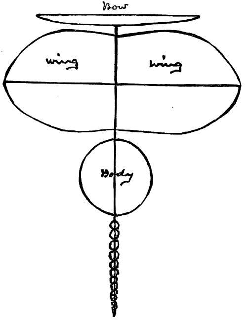 The rib that runs through both wings should bulge out so that the paper on both sides may cave in. This is for the purpose of catching and retaining36 the wind as well as of steadying the kite. To a kite of this shape a tail is needless.