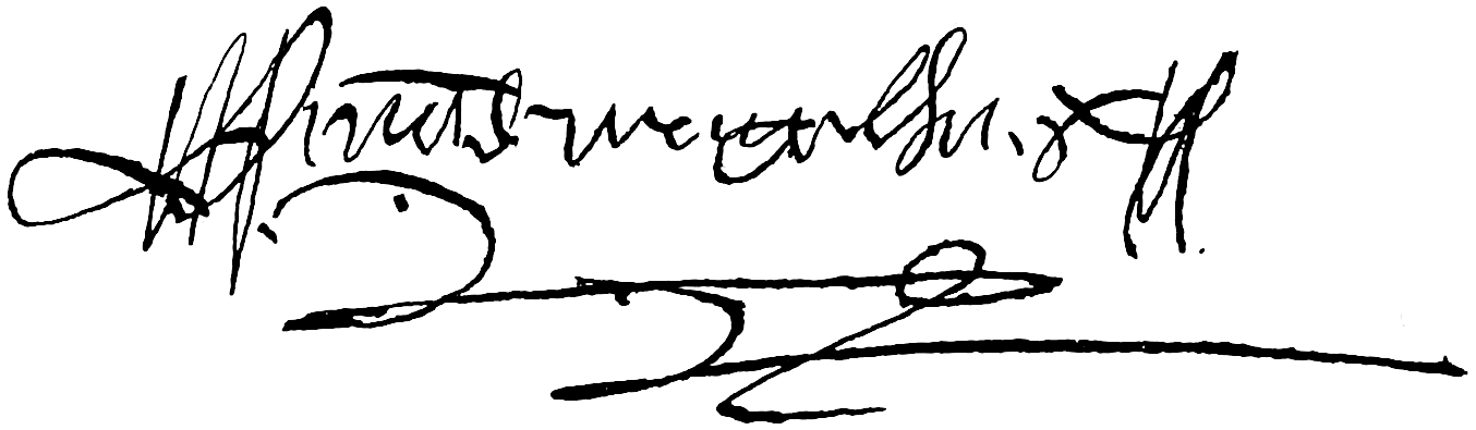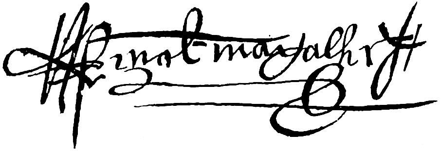 Two facsimiles of the signature of Magellan are given, one taken from his signature to the protocol of the Council of War, held at Cochim in 1510; there is also a facsimile of the signature of another Magellan, taken from the book of Moradias or Palace stipends, attached to a receipt printed by Navarrete, who appears to have supposed it to have been that of the navigator: and a facsimile of the signature of Magellan’s brother-in-law Duarte Barbosa.