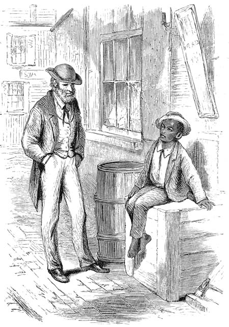 “I am going to school, sir,” returned the boy, knowing that this would put a stop to the urging; and it was successful, for the man, with a few coarse words about “niggers and education,” turned suddenly and walked away, and Tom, with his hands[7] in his pockets, sauntered off in an opposite direction, whistling.