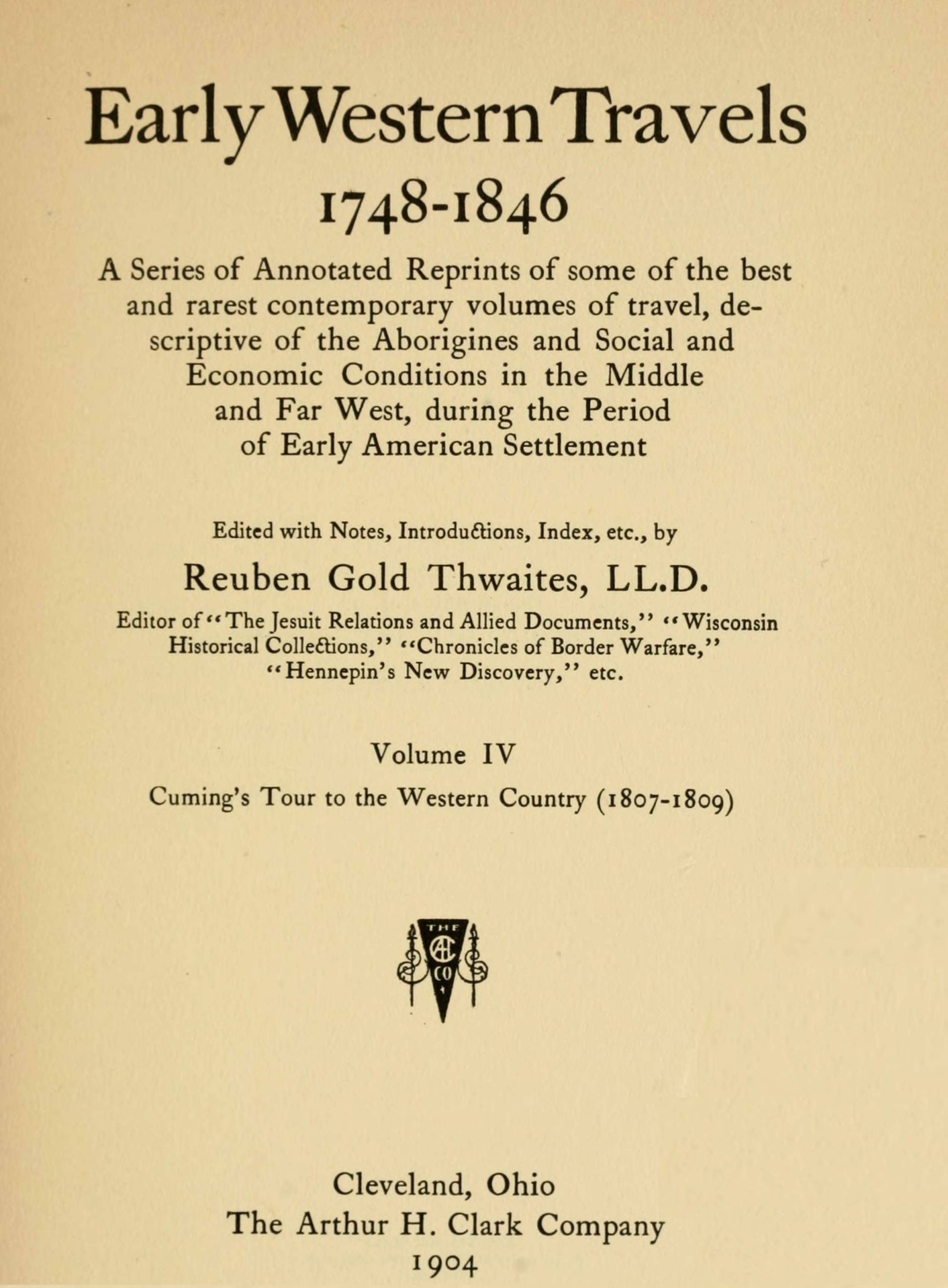 We devote the fourth volume of our series of Western Travels to the reprint of Fortescue Cuming’s Sketches of a Tour to the Western Country—the tour having been made in 1807-1809, the publication itself issuing from a Pittsburg press in 1810.