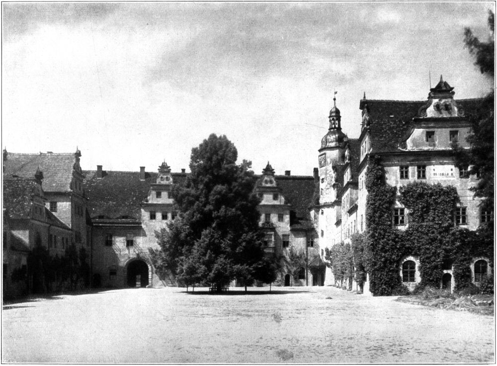 Schon August I. kam oft nach Wermsdorf, um dem edlen Weidwerk obzuliegen, und der rein bäuerliche Ort – es gab damals hier zehn Pferdner und vierzehn Gärtner – sah von da ab des öfteren hohe Gäste. Bald erwies sich das Starschedelsche Schloß zur Aufnahme des Kurfürsten und seines Gefolges als zu klein. Deshalb ließ er 1574 da, wo jetzt die Oberforstmeisterei steht, ein neues Jagdhaus aufführen, wahrscheinlich lediglich zur Unterbringung des Jagdgefolges und Personals. Doch genügte auch das nicht auf die Dauer. Die Nachfolger Augusts, Christian II. (1591 bis 1611) und Johann Georg I. (1611 bis 1656), die gleichfalls eifrige Jäger waren, stellten höhere Ansprüche. Der Bau eines größeren Schlosses war geplant und wurde auch schon 1608 begonnen. Dabei mußten die Bauern des Ortes und der Umgebung Frondienste leisten. Sie fuhren Ziegel von Trebsen und Püchau an und erhielten nur während der Ernte vierzehn Tage Urlaub. Im Dezember 1610 wurde das neue Jagdschloß durch den Bauleiter Steger (den Bauplan hatte Baumeister Simon entworfen) übergeben. Noch stand nur der heutige Nordflügel. Er enthielt im Erdgeschoß, außer Flur und Küche, des Kurfürsten Stube als Versammlungsort des Gefolges mit zwei Kammern, die Stube des Jägermeisters v. Ziegesar mit drei Kammern und Vorgemach, im Obergeschoß, das von Holzwerk mit Ziegeln durchsetzt war, Stuben und Kammern. Die Einrichtung war äußerst bescheiden; denn als Inventar werden angeführt Decken mit eingeschobenen Tafeln, an den Wänden hinlaufende Bänke, Kleiderrechen, wenig Tische, ein Himmelbett des Kurfürsten und Spannbetten für das Gefolge. Bald wurde auf Befehl des Kurfürsten das Obergeschoß massiv aufgeführt und zwei neue Flügel angebaut. 1626 war das Schloß in seiner jetzigen Gestalt fertig. Mitten in dem furchtbaren Dreißigjährigen Kriege. Noch bis 1628 kam der Kurfürst nach Wermsdorf, um zu jagen; dann mußte er, gezwungen durch die widrigen Verhältnisse des Krieges, die Jagd aufgeben. Wiederholt zog die sengende und mordende Soldateska auch durch Wermsdorf, wiederholt war das Schloß der Plünderung preisgegeben. 1639 kamen die Schweden und legten Feuer im Schloß an. Rasches, tatkräftiges Eingreifen der Bewohner verhinderte ein weiteres Umsichgreifen des Brandes, und notdürftig wurden die entstandenen Schäden repariert. Als 1681 Mutzschen völlig abgebrannt war, mangelte es an Gelegenheit, das Amtshaus unterzubringen. Durch kurfürstlichen Befehl wurde der Nordflügel des Schlosses als Amtsexpedition und Wohnung für den Amtsschösser[85] eingerichtet. Erst 1685 kam Johann Georg III. mit seinen Ministern und mit General Flemming wieder zur Jagd hier an.