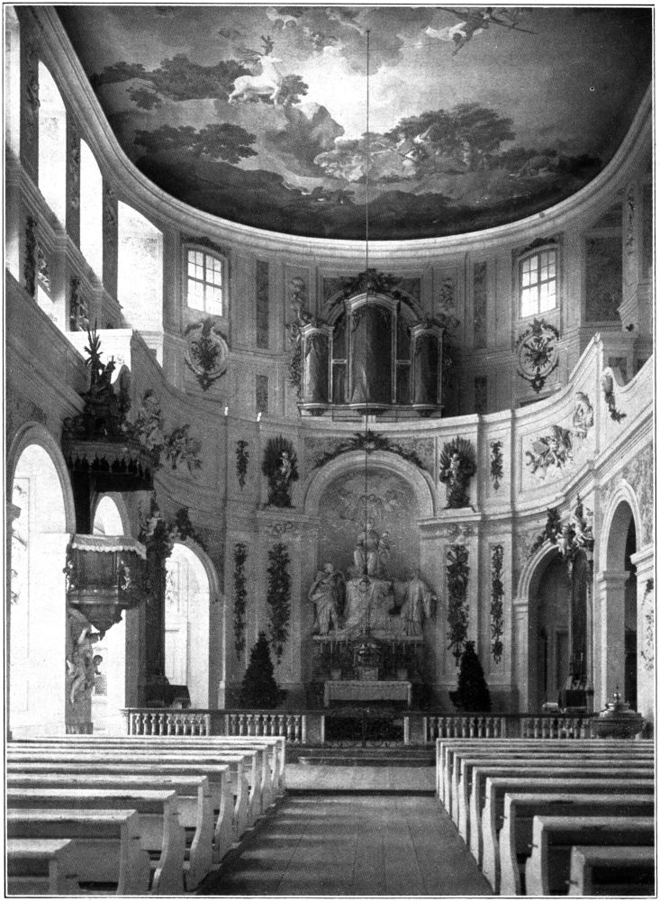 Obgleich das Schloß für vollendet gelten konnte, wurden in ihm doch immerfort Verschönerungen vorgenommen. Oberlandbaumeister Knöffel war zumeist in Hubertusburg anwesend und richtete z. B. 1738 zwei Zimmer mit kostbaren Spiegeln, wertvollen Bildhauer- und Vergoldungsarbeiten ein. Aber der Nachfolger August des Starken, König Friedrich August II., wollte die Hubertusburg noch großartiger gestalten, und Graf Brühl schaffte unbedenklich die Mittel zur Vollendung des Baues aus dem ohnehin schon[92] arg verschuldeten Sachsenlande herbei. Da wurde denn mit der Ausführung der neuen Pläne auch nicht lange gezögert. 1739 riß man plötzlich fast das gesamte Hauptschloß wieder ab und führte einen neuen Hauptteil mit Turm auf der bisher unbebauten Seite des inneren Hofes auf. Die beiden Seitenflügel führte man an dieses heran und verband sie gegenüber dem neuen Hauptflügel wiederum. Der innere Hof war somit allseitig von hohen Gebäuden umschlossen, ein gewaltiger quadratischer Komplex erhob sich an Stelle des zierlicheren Schlosses, das Naumann gebaut hatte. Entsprechend dem ovalen Risalit des Hauptflügels, das der Turm krönte, schloß man den äußeren Hof nach Osten zu durch zwei Rundflügel ab und baute entlang der Anfahrt Kasernen für die Leibgarde. Hunderte von Arbeitern förderten das Werk mit solchem Fleiße, daß bereits 1742 die neue Front mit dem zierlichen, luftigen Turm fertig stand, auf dessen höchster Spitze wieder der stark vergoldete Hirsch als Wetterfahne glänzt. Ein prachtvoller runder Saal, der kleine Hubertussaal, mit glänzender Marmorwand und kunstreichen Gemälden, lag in der Mitte über dem großen runden Portale, durch zwei Etagen sich erhebend. Bis auf den marmornen Fußboden herab reichen die großen Bogenfenster, die als Türen auf einen Altan führen, der eine weite Aussicht nach der Oschatzer Gegend bietet. Weithin tönten die harmonisch eingestimmten[94] Glocken durch die großen bogenförmigen Öffnungen des Turmes, dessen Seitenwände wie vier starke Säulen dastehen und sich erst oben wieder vereinigen, um das Dach zu tragen. Die große Uhr zu Füßen des Turmes wurde von vielen als großes Kunstwerk gepriesen. Die ganze linke Hälfte des Hauptflügels war der katholischen Kapelle gewidmet, welche Silvester, Torelli und Grone mit Kunstwerken schmückten und die noch heute im gleichen Zustand erhalten ist. Zwei hohe Säulengänge im Innern tragen die Emporen, alle Wände sind von glänzendem Gipsmarmor. Der Hochaltar ist eins der besten Werke des Lorenzo Mattielli, und die Kanzel bezeichnet Gurlitt als eines der schönsten Stücke sächsischen Rokokos. Ein schwebender Engel scheint sie zu tragen, zierliche Putten beleben das ganze Meisterwerk. Neben dem Hochaltar, dessen Stufen von sächsischem (Crottendorfer) Marmor sind, stehen noch zwei Seitenaltäre, deren einer das Bild des Hubertus und des ihm mit dem Kreuz des Erlösers im Geweih erscheinenden weißen Hirsches, deren anderer das Bild der Ida von Toggenburg mit dem ihr leuchtenden Hirsche trägt. Beide Gemälde sind von Sylvester. Aus der früheren Schloßkapelle wurden vier weitere treffliche Bilder des Torelli übernommen. Das vielbewunderte Deckengemälde von Baptist Grone stellt auf einer Fläche von vierhundert Quadratmetern die Hubertussage dar.