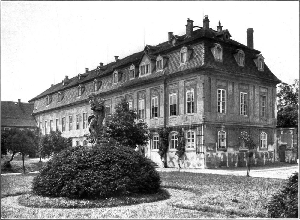 Das Palais bestand aus einem Mittelgebäude, auf dessen achteckigem Mittelteil ein origineller Turm mit einem riesigen vergoldeten Hirsch als Wetterfahne thronte, und zwei Seitenflügeln. Dadurch war ein Hof gebildet, der nur nach Osten offen war. Die Front des Palais war dem Horstsee zugekehrt, und man überschaute von ihr aus den vom Kgl. Kunst- und Lustgärtner Perisch sehr kunstvoll terrassenförmig eingerichteten, mit vielen Bassins, Springbrunnen und Bildsäulen gezierten Garten, der als einer der schönsten Sachsens bezeichnet wird. Links im Mittelbau war eine katholische Kapelle eingebaut. Sie war dem Hubertus geweiht und durch die über dem Altar von Balthasar Permoser in Stuckmarmor dargestellte Bekehrungslegende geziert. Rechts befand sich im ersten Stockwerk der durch zwei Etagen hindurchgehende, herrliche Hubertussaal mit hohen Bogenfenstern. Breite Sandsteintreppen führten zu beiden Seiten bis unter das gebrochene, mit Kupfer gedeckte Dach, von dem die Götter des Olymp in zahlreichen Statuen herabblickten. Überall war Glanz und Pracht. Dem Hauptschloß entsprechend waren die umfangreichen Seitengebäude, die beiderseits am Hauptpalais beginnend, den großen äußeren Schloßhof umgrenzten. Da waren die beiden H-förmigen langen Gebäudereihen parallel zum Hauptflügel des Schlosses, deren Querverbindungen den Schmiedehof mit dem Wermsdorfer Tor im Norden und im Süden den[87] deutschen Jägerhof mit dem Reckwitzer Tor vom großen Hof trennten. Als Gebäudeabschluß stand je ein schöner Pavillon, deren einer später durch Graf Brühl bemerkenswert wurde und seinen Namen »Brühlscher Pavillon« noch heute hat. Im Osten war die Haupteinfahrt, das Oschatzer Tor mit der Zugbrücke, links und rechts weitere Gebäude und Pavillons. In letzteren wohnten zumeist Offiziere, in den langen Gebäuden waren unten Pferdeställe, Hundeställe und Wagenschuppen, oben Räume für die Bediensteten. Links vom deutschen Jägerhof befand sich der französische mit zwei einander parallel laufenden Reihen von Wohn- und Stallgebäuden, und links vom großen Hof, hinter dem Schmiedehof, lag der große Geschirrhof mit einem Waschhaus, einer Bauscheune, Pagenställen, Wohnungen und dem Wasserhaus. Durch eine doppelte Rohrleitung wurde das Wasser aus einer Entfernung von mehr als einer halben Stunde in den Behälter des Wasserhauses geführt, und von hier aus in die Bassins des Schlosses und des Gartens verteilt.