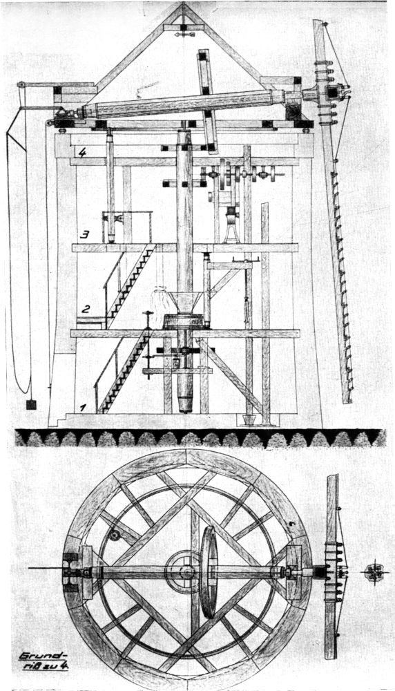Nach dem Brande wurde die Mühle wieder aufgebaut, nicht als Bockwindmühle, sondern als »Holländer«. Sie ist die letzte Windmühle des Vogtlands! – Einer meiner ehemaligen Volontäre, Herr Spörl, hat auf meine Veranlassung hin monatelang seine knappe Freizeit darangesetzt, in allen Winkeln der Mühle herumzukriechen, zu messen und zu skizzieren, und dann nach seinen Aufnahmen eine gute und wertvolle Zeichnung von der Inneneinrichtung der Mühle anzufertigen. Hier ist eine Teilansicht davon, an Hand deren sich auch der Laie ein Bild vom Innenwerk einer Holländer Windmühle machen kann.