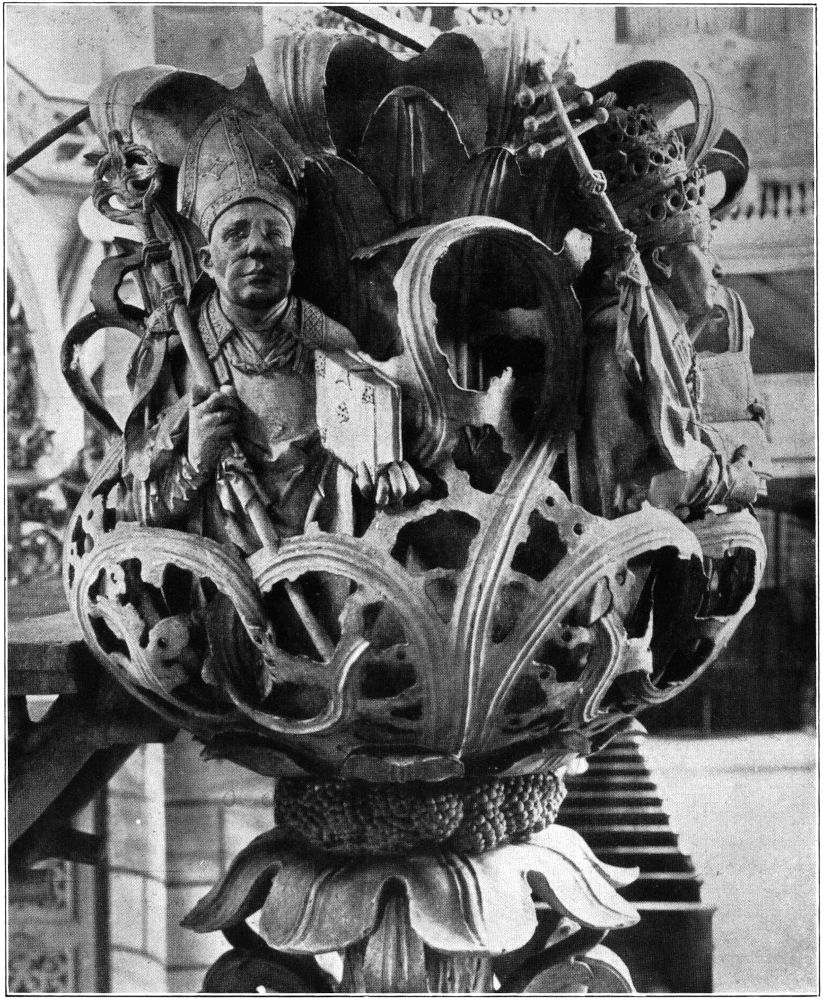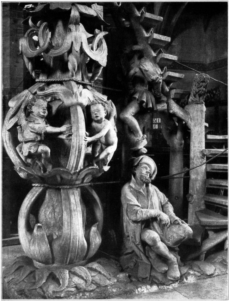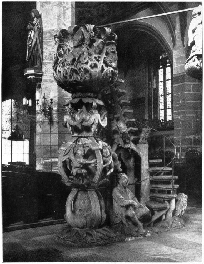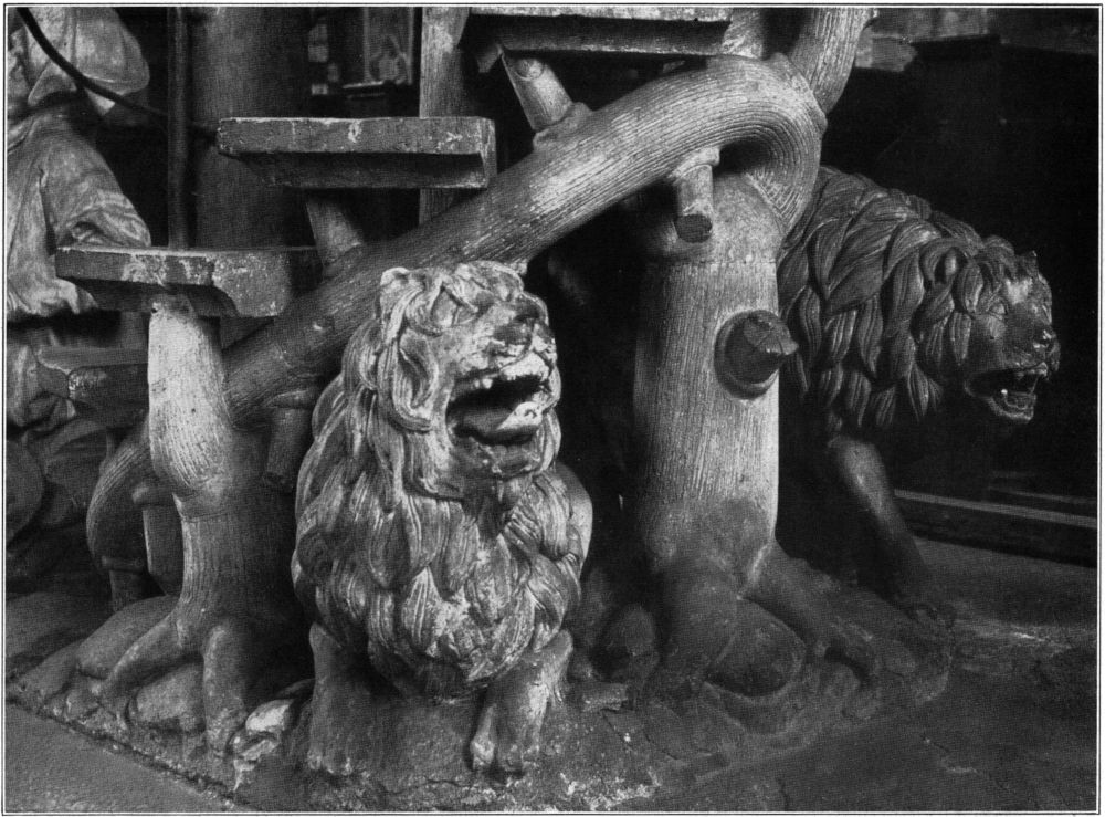 Der Meister H. W. hat den Ulrich Rülein von Calbe, als er seine Distelkanzel für den Dom entwarf, zunächst wohl als den Repräsentanten des Freiberger Stadtgeistes und als geistigen Patron des Bergbaus ins Auge gefaßt, darüber hinaus aber gab ihm dessen selbstgewählter Name Daniel die Veranlassung, als Symbol der furchtbaren Gefahren, die ihn und die Bürgerschaft während der Pest umtobt hatten, die gräßlichen Löwen an der Kanzel anzubringen[141] und damit zu sagen: wie der Prophet Daniel durch Gottvertrauen und Mut die Ungeheuer der Löwengrube überwand, so hat Rülein, durch unerschrockene Hilfeleistung als Arzt die Stadt von der Pest befreit. Demnach ist die Gestalt Rüleins, wie er zu Füßen der Kanzel demütig der Dankpredigt lauscht, die seine und der Bürgerschaft Errettung feiert, durch die ihn umkreisenden Löwen zugleich ein Denkmal für das Heldentum, das er als Arzt bewiesen hat. (Abb. 5.)