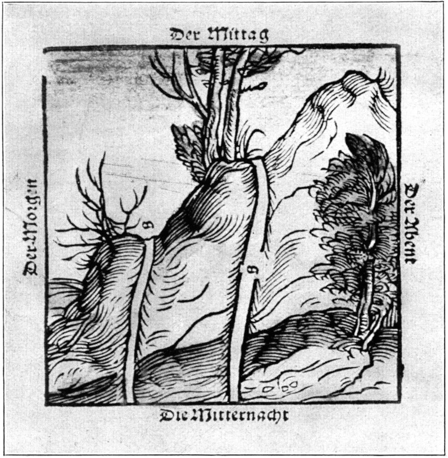 Aber es gibt noch mehr Beziehungen zwischen dem Bergwerksbüchlein und der Distelkanzel. Das Baumwerk, an dem die Kanzel verankert ist, findet sein Gegenstück in dem Baumwerk, das Rülein in einigen Zeichnungen seines Bergbüchleins verwendet hat, um der Bergwerkslandschaft ihr Gepräge zu geben. (Abb. 6.) Auch ähnelt die schuppenartige Gesteinschichtung des Rüleinschen [142]Goldwerkbildes auf dem Bogen CV in dem Augsburger Druck von 1534 (Abb. 7) sehr der Felsschichtung, aus der sich die Distelkanzel des Freiberger Doms erhebt. Wer kann sagen, ob diese Übereinstimmung, wenn sie nicht eine rein zufällige ist, darauf hindeutet, daß der Meister H. W. den Rülein beeinflußt hat, oder ob Rüleins technisch und künstlerisch gebildeter Geist den Meister H. W. dahin beeinflußte, daß er seiner kühn naturalistischen Kanzel durch Anlehnung und Verknüpfung an die entlaubten, ineinanderverwachsenen Baumstämme Halt verlieh? Auch das Baumwerk am Portal der Chemnitzer Schloßkirche, in das der Meister H. W. später seine Gestalten hineingestellt hat, ist eine Weiterbildung des bei der Distelkanzel und noch früher schon im »Bergwerksbüchlein« verwendeten naturalistischen Motivs. Jedenfalls bestanden zwischen diesen beiden hochstrebenden Geistern, dem Meister H. W. und dem Bürgermeister Rülein, tiefwurzelnde Beziehungen und Wechselwirkungen. Diese Beziehungen wurden auch nach der Vollendung der Distelkanzel weitergesponnen. Denn der Meister H. W. hat noch ein zweites Werk geschaffen, in dem Ulrich Rülein von Calbe leibhaftig dargestellt ist: das ist ein allerdings stark verwittertes, aber in den Hauptzügen noch wohlerkennbares kreisrundes[143] Hochrelief, das ursprünglich als Schlußstein des Gewölbes über dem Bergaltar der St. Annenkirche diente, später aber an der Ecke eines Vorhäuschens zur Kirche angebracht war (s. Ernst Oswald Schmidt, Die St. Annenkirche zu Annaberg S. 34) und sich jetzt im Innern befindet. In diesem Relief ist nicht der geschichtliche Vorgang der Fündigwerdung Annabergs vom 27. Oktober 1492 dargestellt, sondern die sich darum rankende Sage, in der der schürfende Bergmann Caspar Nietzel aus Frohnau, offenbar unter dem Einfluß von Rüleins Bergwerkbüchlein, ersetzt ist durch den »armen Bergmann Daniel Knappe«. Wir besinnen uns darauf, daß in Rüleins Büchlein der Bergverständige Daniel zu dem jungen Knappius spricht. Wir sehen auf dem Relief (Abb. 8) die Tanne, in deren Zweigen Daniel Knappe, einem Traume folgend, vergebens nach den silbernen Eiern gesucht hat. Darüber schwebt noch der Engel Gottes, der ihm den Gedanken eingab, daß auch die Wurzeln zu den[144] Zweigen gehörten. Auf der rechten Seite sehen wir, wie ein Bergmann nunmehr mit Erfolg an den Wurzeln des Baumes geschürft hat, in der Mitte steht Daniel Knappius, der den Fund in der Hand hält und ihn dem wieder in seiner Schaube und dem eigenartigen Hut erschienenen Bergverständigen Rülein zeigt, der den Fund begutachtet. Er ist unterdessen älter geworden, das Gesicht ist faltig, aber die Ähnlichkeit mit der sitzenden Gestalt am Fuße der Distelkanzel unverkennbar. Auch die an der Freiberger Figur verstümmelte und (1862) schlecht ergänzte Nase ist hier als eine echte Adlernase erhalten. Das ganze ehrwürdige Antlitz zeugt von Geistesschärfe und Willenskraft. In dieser aus der vollen Realität des Lebens gegriffenen, durchaus individuellen Gestalt die Darstellung des alttestamentlichen Propheten Daniel zu finden, ist mir schlechterdings unmöglich, zumal da hier auch nicht das geringste Symbol vorhanden ist, das sich auf den Propheten beziehen ließe. Ebensowenig aber läßt sich an der Identität des Annaberger Porträts mit dem an der Distelkanzel zweifeln.