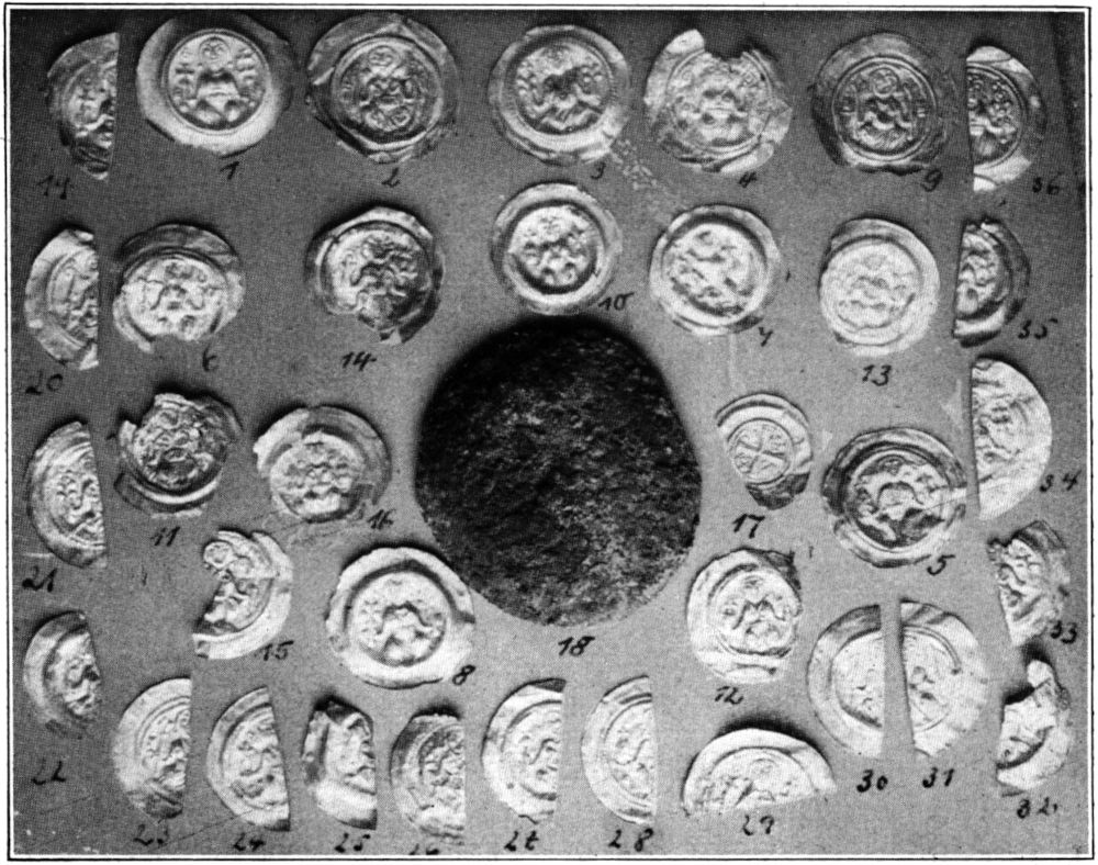 Die Münzen stammen ebenfalls aus dem dreizehnten Jahrhundert, und zwar aus der ersten Hälfte. Es sind einseitig geprägte Brakteaten aus dünnstem Silberblech. Sie sind durchschnittlich vier Zentimeter groß und wiegen ein reichliches halbes Gramm. Das Bild wurde mit einem Stempel aus Hartholz oder Metall eingeschlagen, so, daß es reliefartig hervortritt. Jegliche Angaben über Wert, Hersteller und Prägungsjahr fehlen. Sie wurden nach dem Gewicht gewertet. Darum zerschnitt man sie ohne Bedenken in Halbe und Viertel, wie sich solche Teile bei dem Fund in gleicher Anzahl wie die ganzen Stücke fanden. Sie dienten nur zum Ausgleich und dem Kleinverkehr. Das Hauptzahlungsmittel war der Silberbarren. In einen Schmelztiegel wurde soviel Silber gegossen, als die Zahlung erforderte. Daher die Kugelkappenform des Gußkuchens. War das notwendige Gewicht nicht ganz erreicht, so glich man den Rest mit Brakteaten aus. Nach der karolingischen[159] Münzordnung galt damals noch die Silberwährung. Goldmünzen gab es in Deutschland noch nicht. Die Fürsten hatten Münzhoheit. Eine Menge neuer Münzprägestellen kam dadurch auf. Bedrängte Fürsten haben da oft dasselbe getan, was Deutschland heute tut: viel unedles Metall in das Silber gemengt und minderwertiges Geld geschaffen.