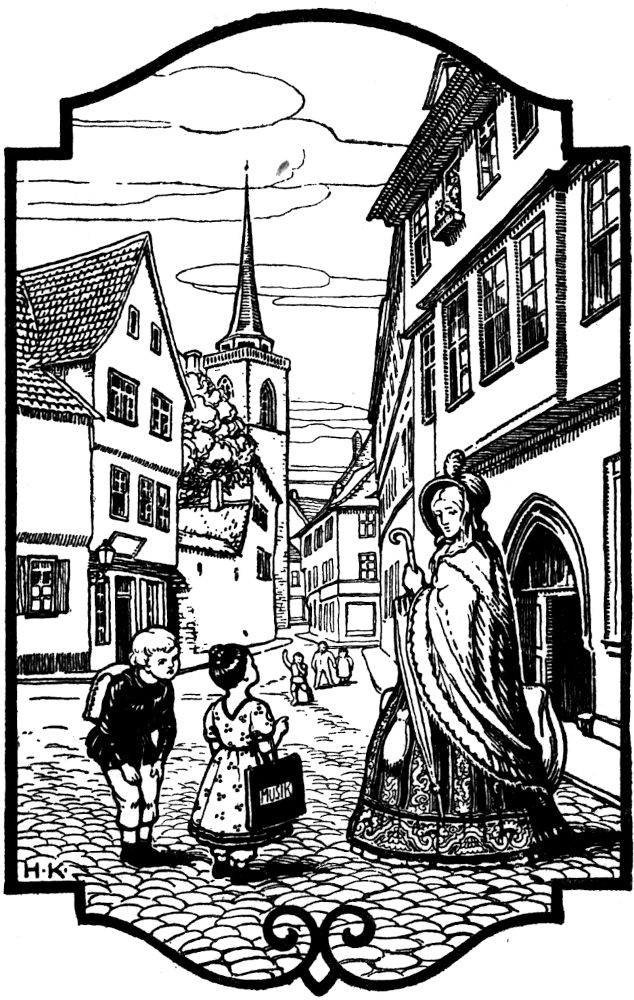 Die Erblasserin ist vor 25 Jahren meine Taufpatin gewesen. Sie war weitläufig mit uns verwandt, »von sieben Suppen eine Schnitte«, wie der Volksmund sagt. Aber gerade diese eine Schnitte hat[6] trotz ihres wunderlichen Beigeschmackes meinen Eltern immer gemundet. – Trotzdem dachte niemand von uns Thüringer Lages an den grauen Alltag. Da kam Tante Jesuliebe einmal drunten von der holländischen Grenze zu uns nach Erfurt. Wie ein altes Bild. Als ob die Zeit stehengeblieben sei, oder als ob die Biedermeierkleidchen, die sie als Kind getragen, mit ihr zugleich gewachsen seien: Die Eltern schickten sich in großer Feierlichkeit an, Tante Jesuliebe in »Gückels Staatswagen« abzuholen, während ich mich dem Mitfahren geschickt entzog und lieber hinter einem Pfeiler an Silbers Hotel versteckt die Ankommende beobachten wollte. In diesen Vorbereitungen stöberte mich ein wunderliches Lebewesen auf, indem es mir einen riesengroßen, roten Regenschirm reichte, wie ihn die Bauern an Markttagen über sich spannen. Dazu schrie es mich an: »Was lungerst und kuckst du? Siehst du nicht, daß es regnet? Spann’ mir den Schirm auf, nimm mir einen Teil Sachen ab, und dann zeig’ mir das schöne, alte Erfurt.« Ihre durchdringenden, grauen Augen sahen mich so stolz und heischend an, daß ich, in altväterischem Gehorsam erzogen, keinen Widerspruch wagte, sondern das Schirmungetüm öffnete. – Darauf hing sie noch an meinen linken Arm ein Marktnetz, das mit einem Zeitungspapier ausgelegt war: »Nachrichten aus der Grafschaft Bentheim.« Bepackt war es mit Haar- und Kleiderbürsten, mit Kämmen, Zahnbürste, Seife und Schwämmen bis oben hin. Sie selbst trug eine große, mit roter Wolle gestickte Reisetasche, die den preußischen[8] Adler in schwarzweißen Perlen zeigte. Auf der Rückseite war in gelber Seide riesengroß »Bon voyage« gestickt. So zogen wir durch Erfurt und hatten ein großes Gefolge hinter uns von Schuljugend und kopfschüttelnden und lachenden Müßiggängern. Ich kam aber gar nicht zum »Schenie«, wie der Erfurter sagt, denn meine Unbekannte erzählte so herrliche Geschichten von jedem alten Hause, von jeder lutherischen oder katholischen Kirche, daß ich ganz glückselig zuhörte und schließlich meinte, sie müsse ja wohl in Erfurt geboren sein, was denn auch der Wahrheit entsprach. »Vor 200 Jahren«, rief sie pfiffig. Und dann standen wir schließlich vor dem alten Kloster, darinnen mein Vater seine Amtswohnung hatte, und die alte Dame meinte, just dahinein wolle sie, und es schiene ihr beinahe, als sei ich ihr Patenkind Brigitte-Jesuliebe Lage. – Oben fanden wir Vater und Mutter und die alte Köchin recht mißmutig vor, da die Großtante nicht angekommen sei.