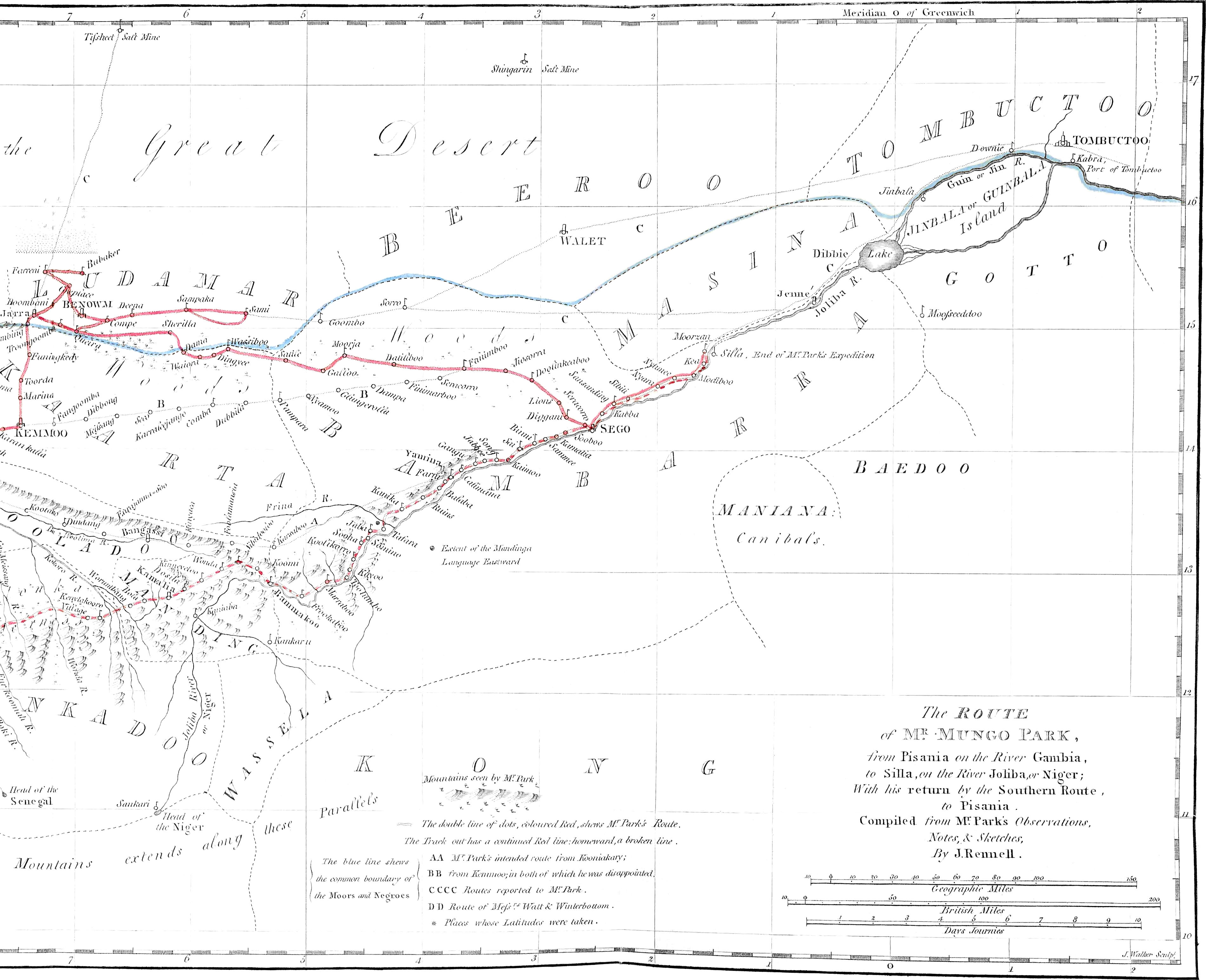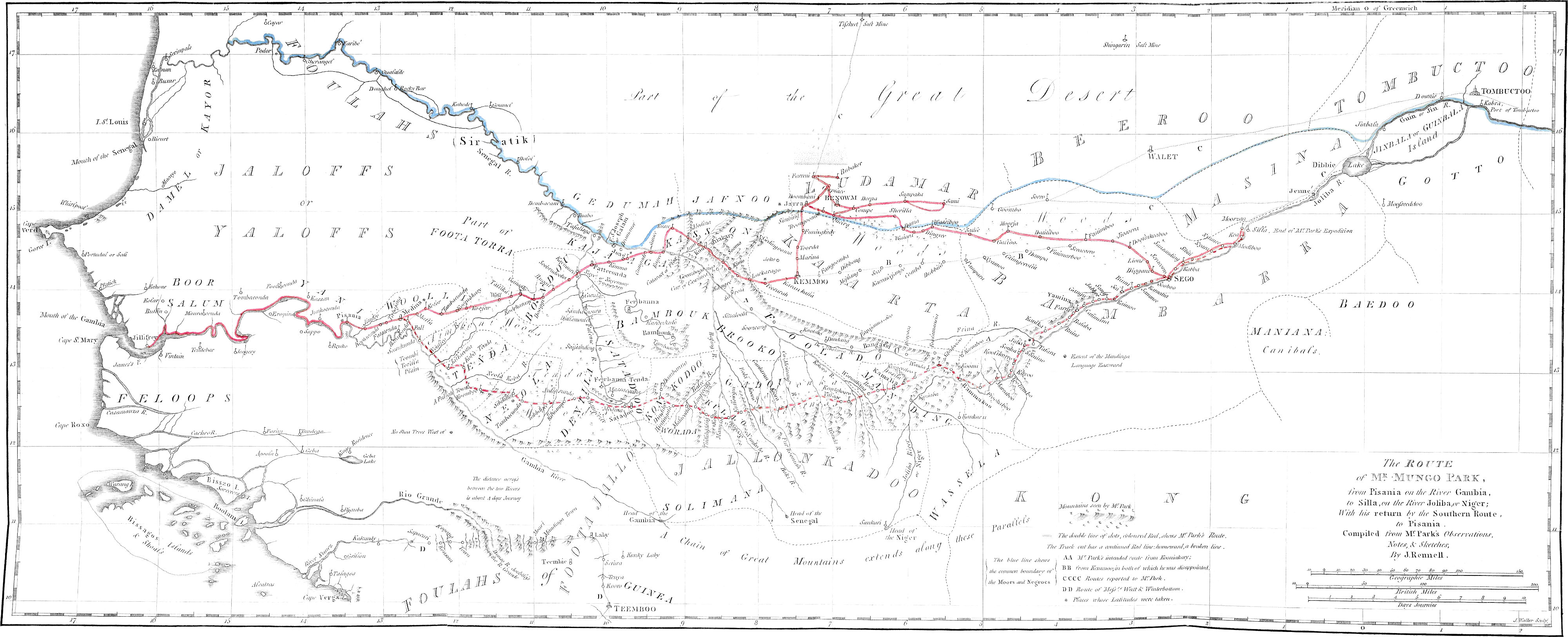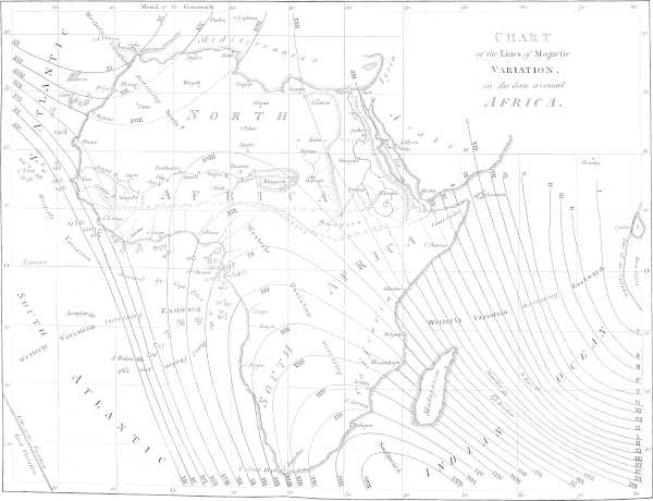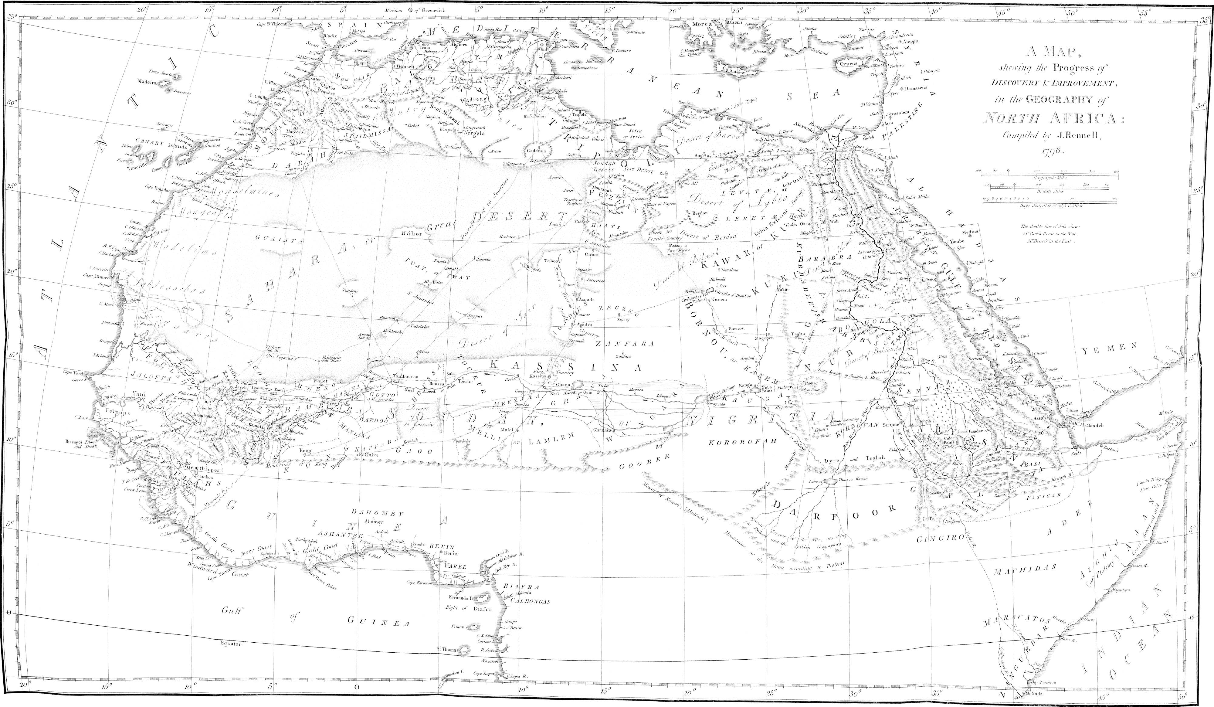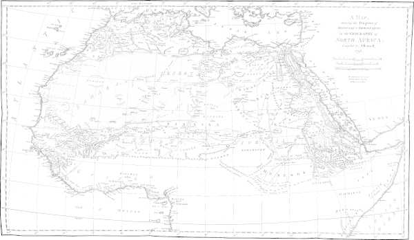 Immediately after my return from Africa, the acting Committee of the Association,[1] taking notice of the time it would[viii] require to prepare an account in detail, as it now appears; and being desirous of gratifying, as speedily as possible, the curiosity which many of the Members were pleased to express concerning my discoveries, determined that an epitome, or abridgment of my travels, should be forthwith prepared from such materials and oral communications as I could furnish, and printed for the use of the Association; and also, that an engraved Map of my route should accompany it. A memoir, thus supplied and improved, was accordingly drawn up in two parts, by Members of the Association, and distributed among the Society: the first part consisting of a narrative, in abstract, of my travels, by Bryan Edwards, Esq.; the second, of Geographical Illustrations of my progress, by Major James Rennell, F.R.S. Major Rennell was pleased also to add, not only a Map of my route, constructed in conformity to my own observations and sketches (when freed from those errors, which the Major’s superior knowledge, and distinguished accuracy in geographical researches, enabled him to discover and correct), but also a General Map, shewing the progress of discovery, and improvement in the Geography of North Africa; together with a Chart of the[ix] lines of magnetic variation, in the seas around that immense continent.