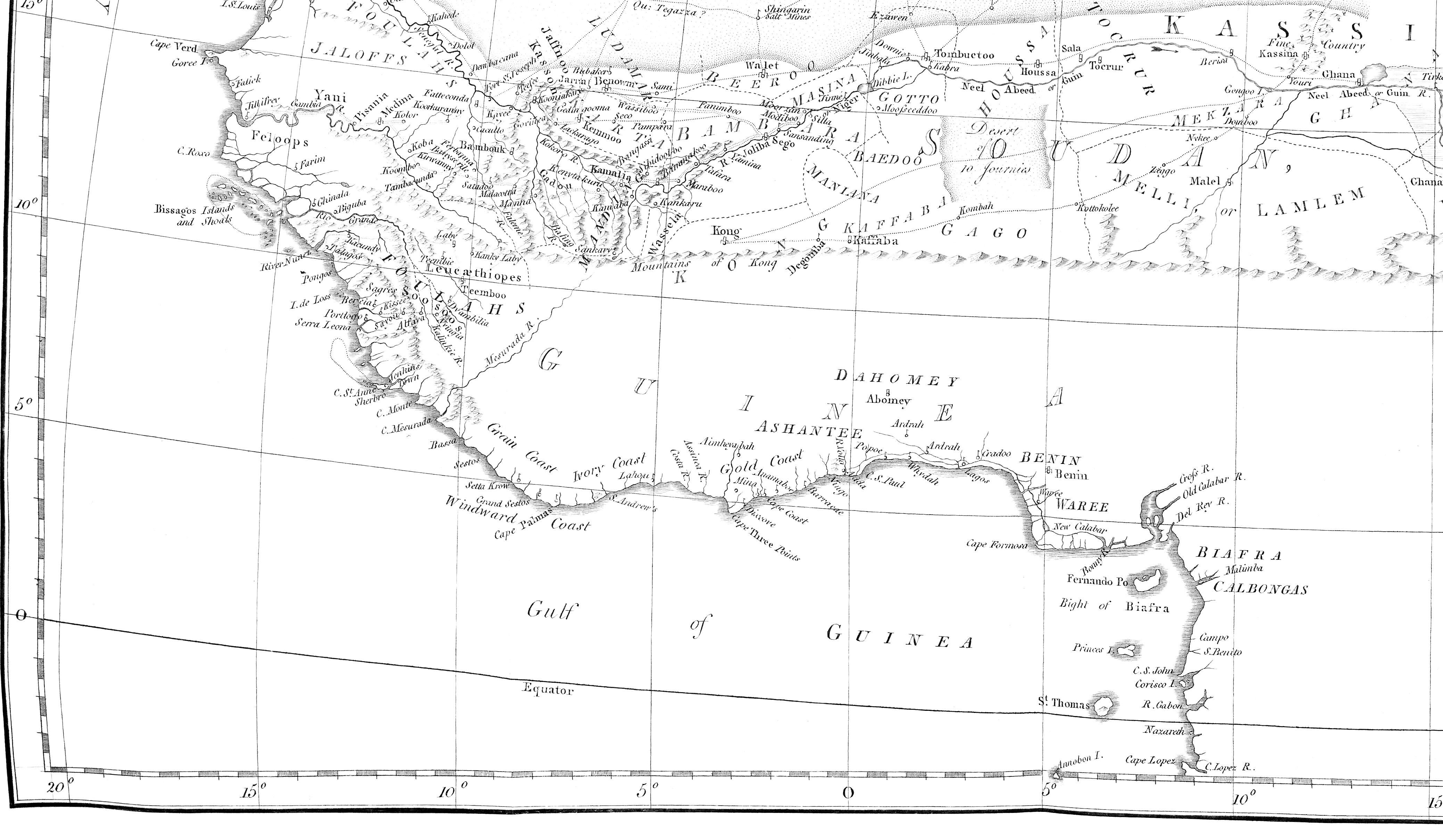 Of the countries between Houssa and Kassina we are ignorant. The Desert seems to approach very near the river (Niger) in that quarter, whence a Moorish population may be inferred. South of the river, we hear of Kaffaba, Gago, and other Negro countries; but without any distinct notices of position; and beyond these, Melli.