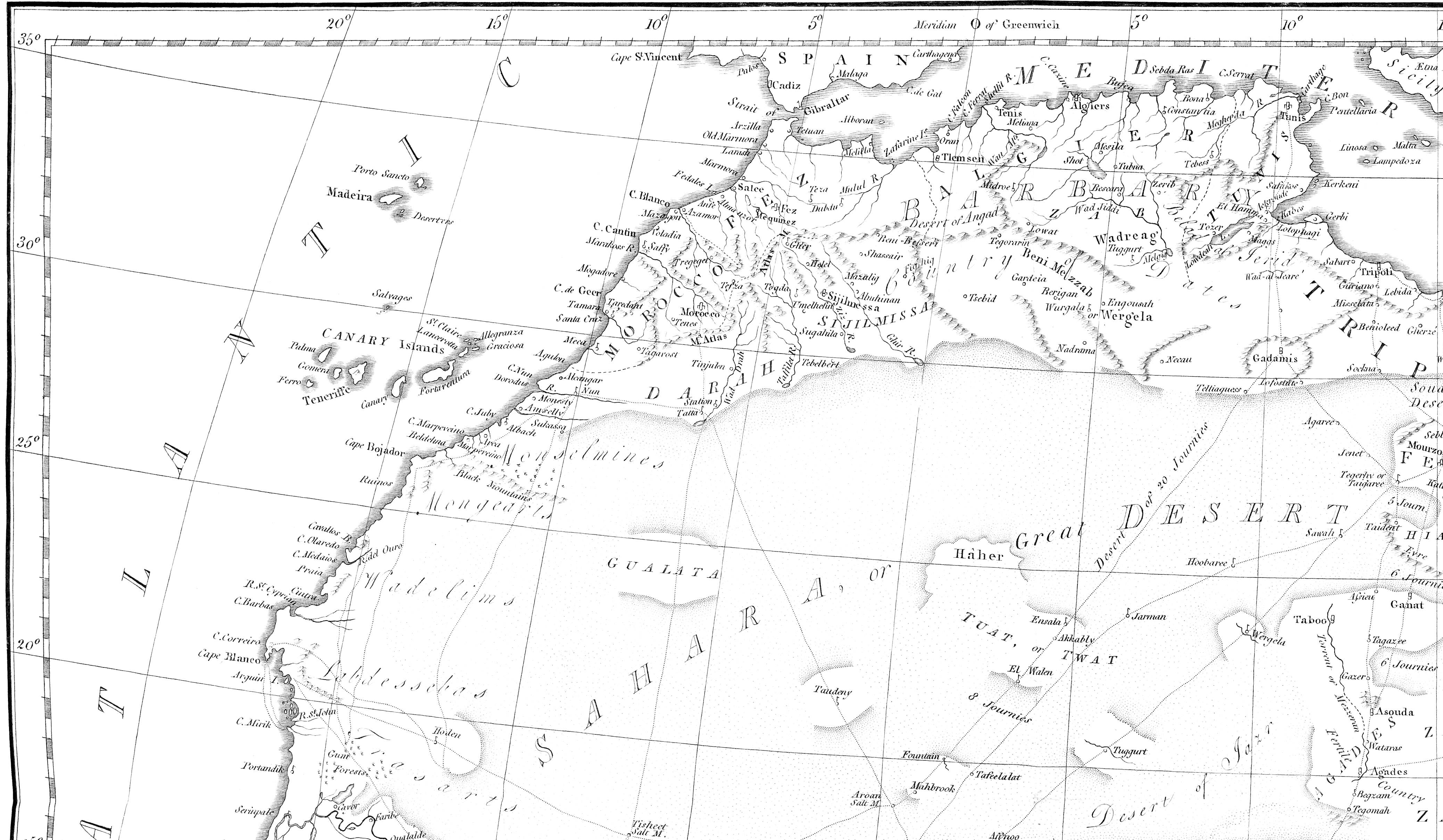 The third part is of course, the Great Desert (or Sahara), and its members; consisting of the lesser deserts of Bornou, Bilma, Barca, Sort, &c. This may be considered as an ocean of sand,[175] presenting a surface equal in extent to about one half of Europe, and having its gulfs, and bays; as also its islands, fertile in groves and pastures, and in many instances containing a great population, subject to order and regular government. The[lxxxiv] great body, or western division of this ocean, comprized between Fezzan and the Atlantic, is no less than 50 caravan journies across, from north to south; or from 750 to 800 G. miles; and double that extent, in length: without doubt the largest desert in the world. This division contains but a scanty portion of islands (or oases) and those also of small extent: but the eastern division has many; and some of them very large. Fezzan, Gadamis, Taboo, Ghanat, Agadez, Augela, Berdoa, are amongst the principal ones: besides which, there are a vast number of small ones. In effect, this is the part of Africa alluded to by Strabo,[176] when he says from Cneius Piso, that Africa may be compared to a leopard’s skin. I conceive the reason why the oases are more common here, than in the west, is, that the stratum of sand is shallower, from its surface, to that of the earth which it covers. In other words, that the water contained in that earth, is nearer to the surface; as in most of the oases it springs up spontaneously.[177] Can any part of the cause be assigned to the prevalent easterly winds, which, by driving the finer particles of sand to leeward, may have heaped it up to a higher level in the Sahara, than elsewhere?[178]