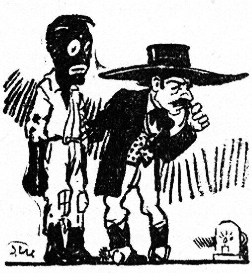 Did we go? Man, that Tequila horse never ran so fast in his life. Why, he never had time to cross his legs. We wasn’t goin’ no place, but we was sure goin’ fast. Out from a pile of busted lumber I sees Peewee raise up, his eyes wide at what he sees.