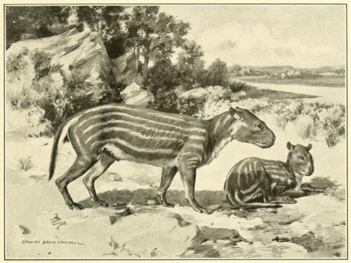 The figures of existing animals are almost all from photographs taken in the New York and London zoölogical gardens, and I desire to thank Director Hornaday, of the Bronx Park, and Mr. Peacock, of the London garden, for the very kind manner in which they have procured these illustrations for my use. The photographs have been modified by painting out the backgrounds of cages, houses, and the like, so as to give a less artificial appearance to the surroundings.