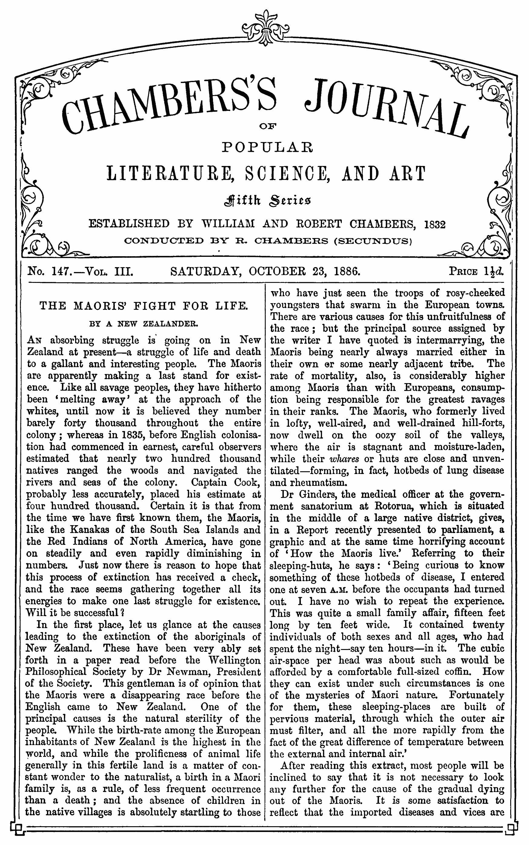 Title: Chambers's Journal of Popular Literature, Science, and Art, fifth series, no. 147, vol. III, October 23, 1886