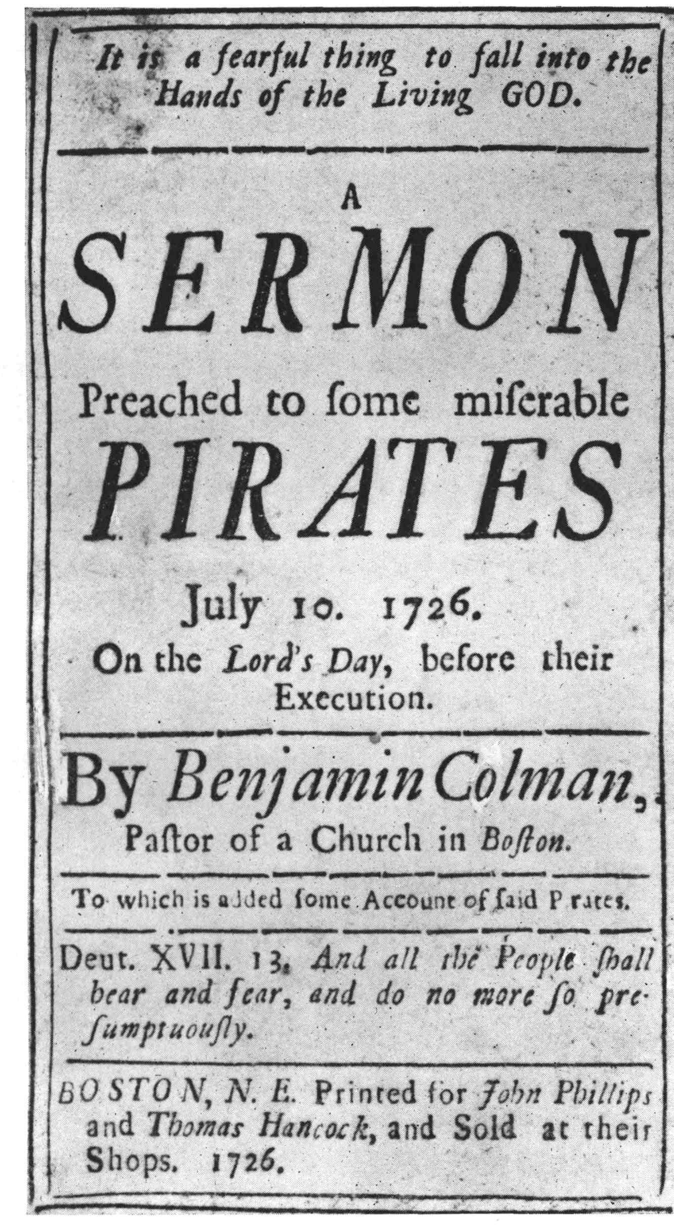 On Fryday the 30th. of June 1704. Pursuant to Orders in the Dead Warrant, the aforesaid Pirates were guarded from the Prison in Boston, by Forty Musketeers, Constables of the Town, the Provost Marshal and his Officers, &c. with Two Ministers, who took great pains to prepare them for the last Article of their Lives. Being allowed to walk on Foot through the Town, to Scarlets Wharff; where the Silver Oar being carried before them; they went by Water to the Place of Execution, being Crowded and thronged on all sides with Multitudes of Spectators. The Ministers then Spoke to the Malefactors, to this Effect.