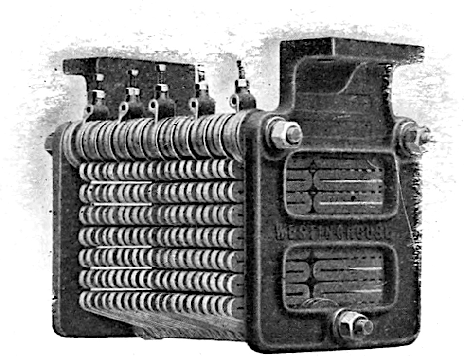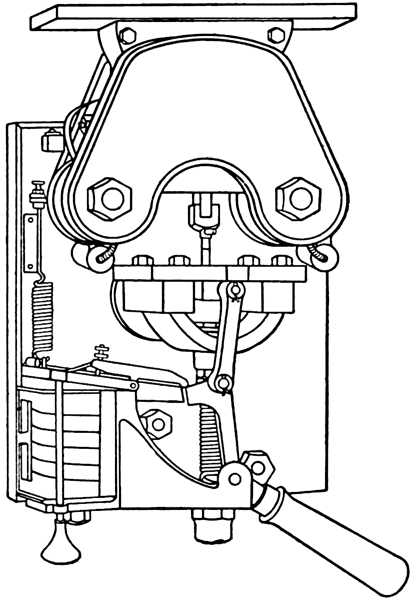 With the single-phase motor the current is supplied to the car with a voltage of say 3300. It is then stepped down by means of transformers on the car to the voltage of the motors, which may 142be 200 or 250 volts. The speed is, of course, dependent upon the voltage applied to the motors, and this voltage is cut down from the maximum, to obtain various gradations, by means of an induction controller, or by taps from an auto-transformer. Thus the motor takes from the trolley only slightly more power than is actually required to operate it at any given speed, instead of taking full voltage from the line and absorbing part of it in dead resistance.