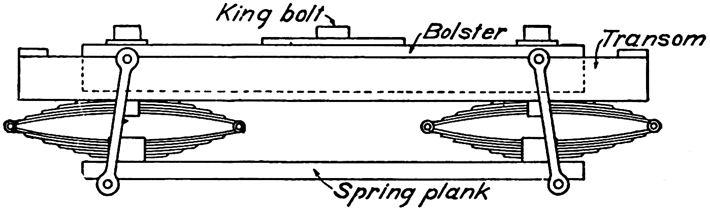 The trucks of double truck cars are usually taken out from under the car body when repairs are to be made. In this case the motor leads, the sand box connections and the brake rigging are disconnected and the car body either raised or the trucks lowered from it. Several 135methods of raising the car body are in use. Where no special apparatus is at hand, this is done by means of jacks, hydraulic or mechanical, placed under the side sills of the car near the end to be raised. Sometimes an overhead crane is employed to lift the car body. A special apparatus to raise the body is employed by the St. Louis Transit Company. This consists of four screw jacks located below the floor of the shop. An I-beam extends over the tops of the two located on the same side of the car. The jacks are motor driven by means of one sprocket chain so that they rise at the same speed. When a car is to be raised it is run on the track between the jacks, bars are placed under the car resting across the I-beams and the jacks raise the car off the trucks. The trucks are then rolled out from under the car and the repairs made.