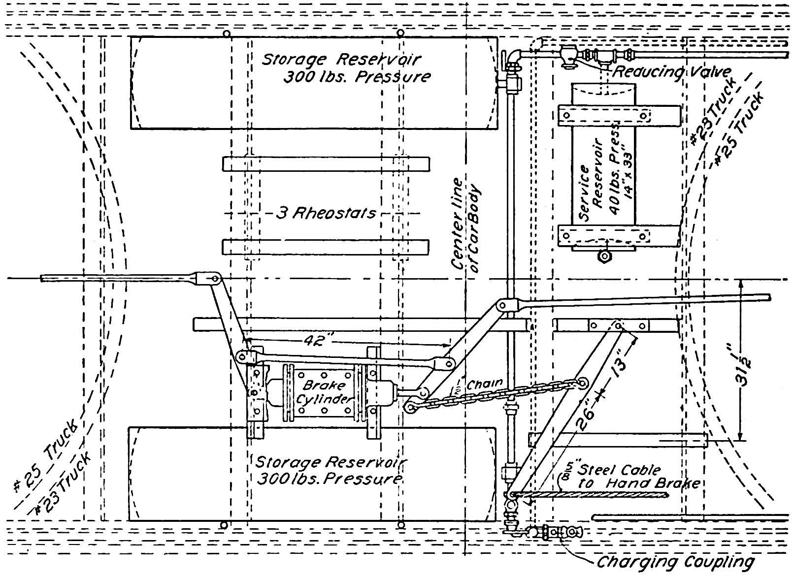 The equipment is being supplied by the Westinghouse Co. The current is generated by revolving-field type turbine-driven alternators. The armatures are designed for either three-phase or single-phase connection. The current is generated at 25 cycles and 11,000 volts, being delivered directly to the trolley, and thence to the cars, without the intervention of any transformers. The double catenary suspension from messenger wires is used to support the trolley. The locomotives are each equipped with four 200-H. P. gearless motors, designed to operate on 235-volt alternating current and 275- to 300-volt direct current. 147The armature is not mounted on the shaft direct, but is built upon a quill through which the axle passes with about ⅝-inch clearance all around. There is a flange at each end of the quill from which seven pins project and fit into the hubs of the driving wheels. On the direct-current part of the line, current is delivered to the car through eight collecting shoes from a third rail. On the alternating-current section, current is delivered through two pantograph bow trolleys. On the direct-current section the series-parallel method of speed control is used, current being fed directly to the motors which are connected two in series permanently and the series-parallel control is applied to the motors in groups of two. The alternating-current speed control is accomplished by six taps from an auto-transformer for the corresponding running points. The cars weigh 78 tons and are capable of a speed of 60 to 65 miles per hour. The electro-pneumatic unit-switch type of control is used. At each end of the cab is a master controller from which the main controller is operated. Several locomotives can be operated together on the multiple-unit system, if desired.