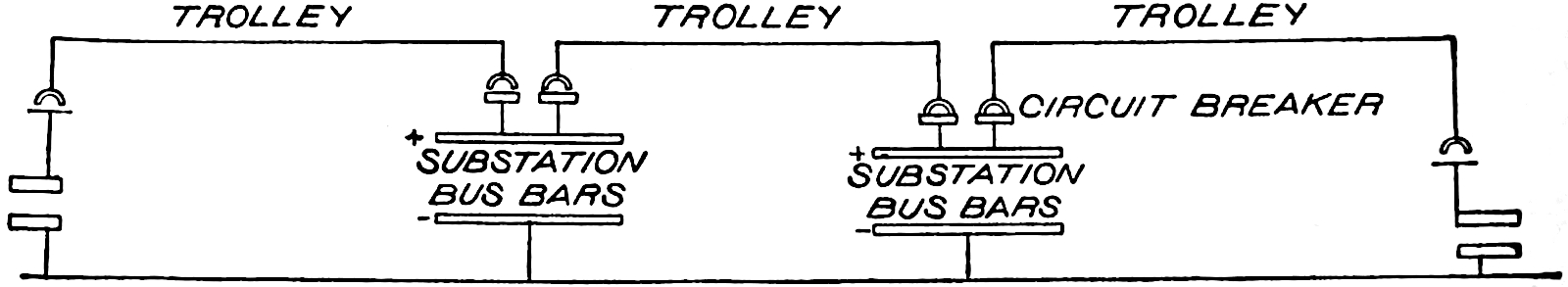 All electric railway systems in commercial use are operated on an approximately constant potential or voltage, and the various electric motor cars operating on the system are connected across 2the lines in parallel. The most common practice is to utilize the rails and ground as one side of the circuit, and the overhead trolley wire or “third rail” as the other side, as in Fig. 1. The trolley wire or third rail is, of course, thoroughly insulated from the ground. The positive poles of the generators at the power house are usually connected to the trolley wire, and the negative poles to the rails and ground. The various electric motor cars, being connected in parallel or multiple between the trolley wire and the ground, draw whatever current is necessary for their operation. Where the conduit system is used, both sides of the circuit are insulated from the ground, and the contact shoe or plow collects current from two conducting rails in the conduit, one of these conducting rails being positive and the other negative. A double-trolley system is also in use to a limited extent. In this system, both the positive and the negative sides of the circuit are insulated from the ground, one trolley wire being positive and the other negative.