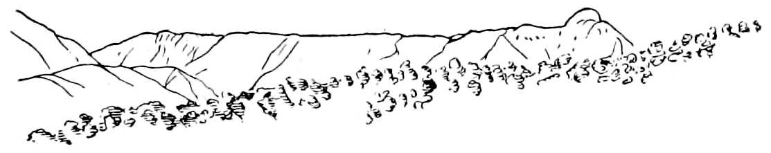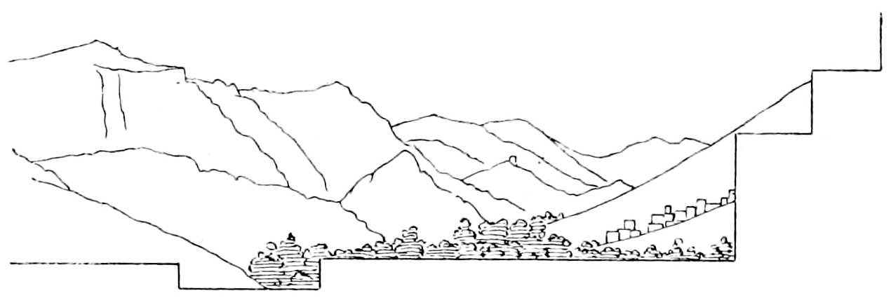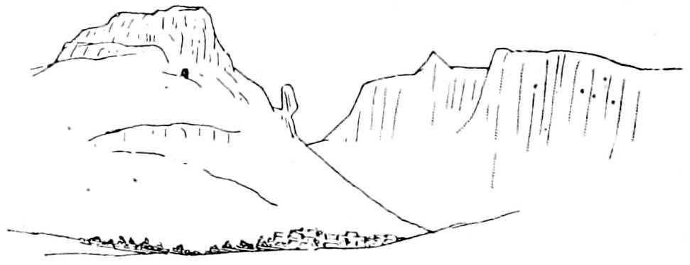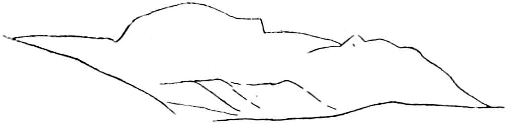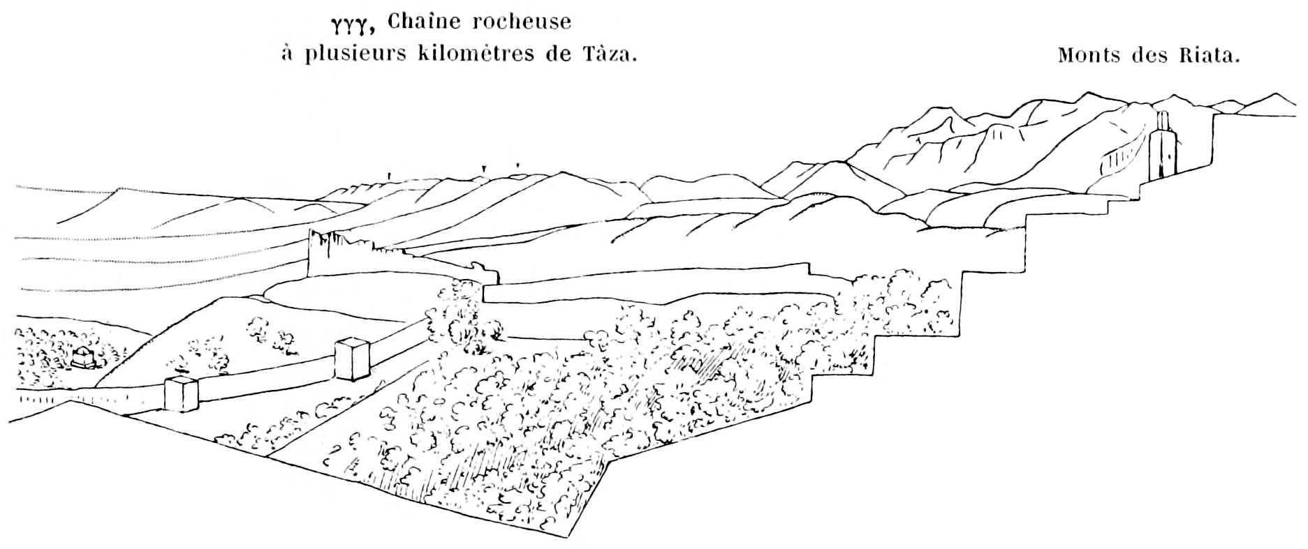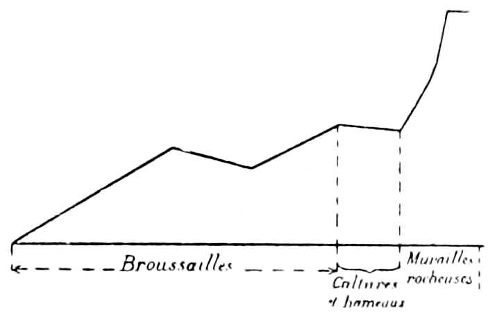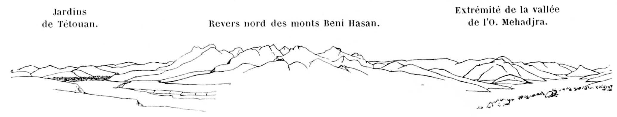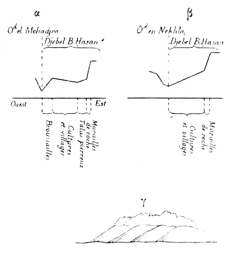 Toute la journée, il y avait des passants sur le chemin, dans les champs une foule de travailleurs. Ainsi que nous l’avons dit, la plupart des cultures consistent en blé ; cependant on rencontre aussi de l’orge et, de loin en loin, quelques champs de maïs. Deux cours d’eau importants : l’Ouad Tétouan (berges de terre presque à pic de 4 ou 5 mètres de haut ; lit de 12 mètres de large, rempli d’eau courante et assez claire, de 50 à 60 centimètres de profondeur ; fond de sable) ; et l’Ouad Meḥadjra (voici ce qu’il est dans sa partie inférieure : berges à peine marquées ; eaux vertes, de 6 à 8 mètres de large et de 30 ou 40 centimètres de profondeur, serpentant dans un lit de galets beaucoup plus large ; courant très rapide). Le Djebel Beni Ḥasan est un massif extrêmement remarquable : le versant occidental en affecte, dans sa partie nord, la forme suivante : α ; dans sa région sud, celle-ci : β ; les plus hauts sommets, dont les cartes marines nous donnent les altitudes, 1410 mètres, 2210 mètres, 1818 mètres, en sont invisibles du fond de la vallée ; une haute muraille de pierre grise, à crête dentelée, le couronne de ce côté et lui donne l’aspect le plus étrange : on dirait une série de rochers de Gibraltar juxtaposés sur un piédestal de montagnes : quelque chose comme ceci : γ. La crête supérieure de cette muraille me paraît être à une altitude à peu près uniforme pouvant varier entre 1200 et 1500 mètres. Au-dessus, quelques cultures entrevues en deux ou trois points semblent révéler l’existence d’un plateau.
