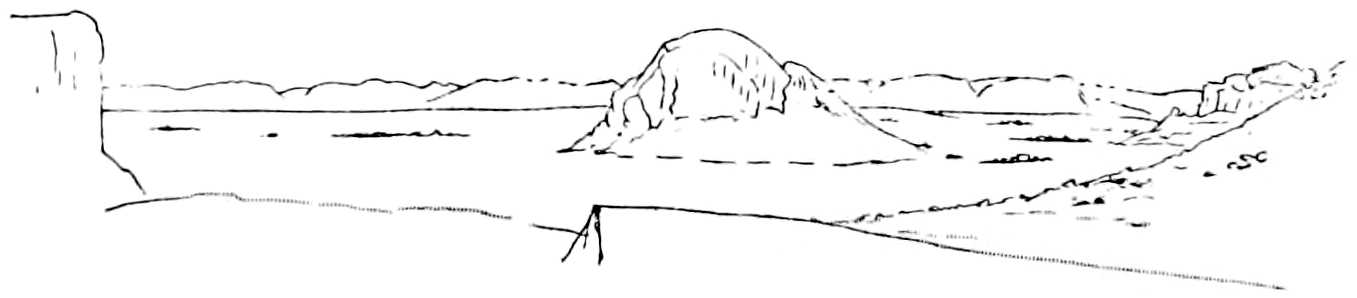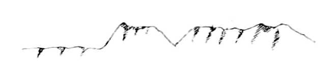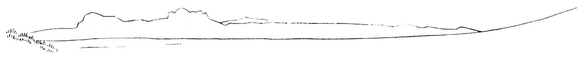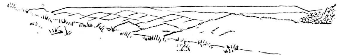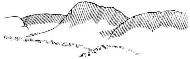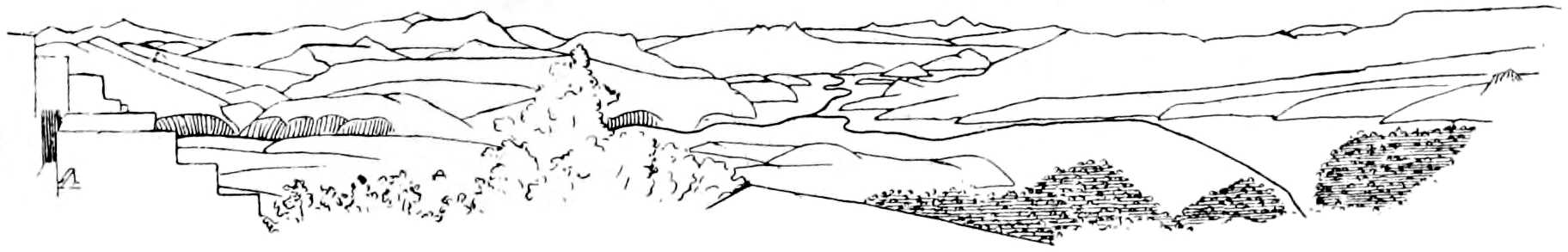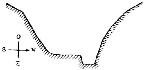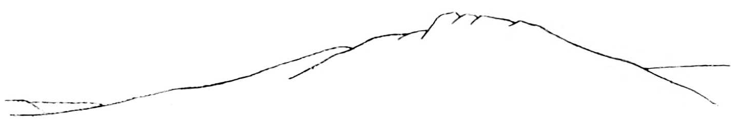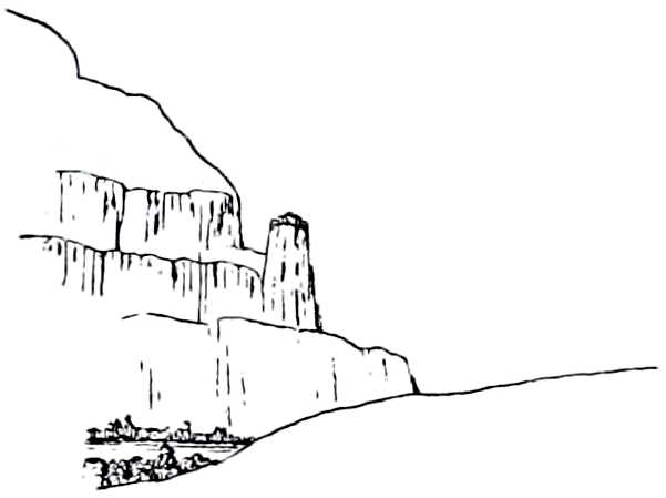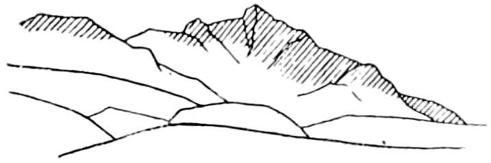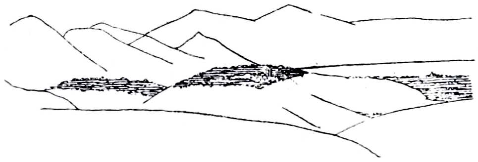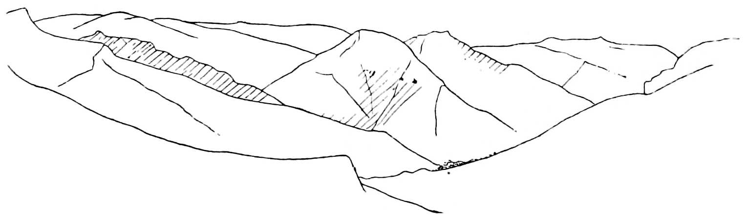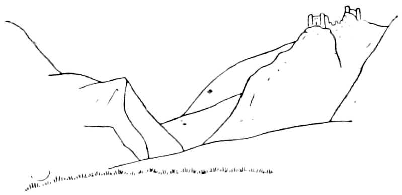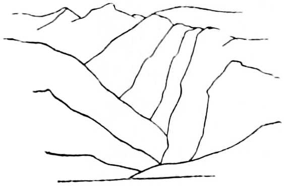 Toute la journée, il y avait des passants sur le chemin, dans les champs une foule de travailleurs. Ainsi que nous l’avons dit, la plupart des cultures consistent en blé ; cependant on rencontre aussi de l’orge et, de loin en loin, quelques champs de maïs. Deux cours d’eau importants : l’Ouad Tétouan (berges de terre presque à pic de 4 ou 5 mètres de haut ; lit de 12 mètres de large, rempli d’eau courante et assez claire, de 50 à 60 centimètres de profondeur ; fond de sable) ; et l’Ouad Meḥadjra (voici ce qu’il est dans sa partie inférieure : berges à peine marquées ; eaux vertes, de 6 à 8 mètres de large et de 30 ou 40 centimètres de profondeur, serpentant dans un lit de galets beaucoup plus large ; courant très rapide). Le Djebel Beni Ḥasan est un massif extrêmement remarquable : le versant occidental en affecte, dans sa partie nord, la forme suivante : α ; dans sa région sud, celle-ci : β ; les plus hauts sommets, dont les cartes marines nous donnent les altitudes, 1410 mètres, 2210 mètres, 1818 mètres, en sont invisibles du fond de la vallée ; une haute muraille de pierre grise, à crête dentelée, le couronne de ce côté et lui donne l’aspect le plus étrange : on dirait une série de rochers de Gibraltar juxtaposés sur un piédestal de montagnes : quelque chose comme ceci : γ. La crête supérieure de cette muraille me paraît être à une altitude à peu près uniforme pouvant varier entre 1200 et 1500 mètres. Au-dessus, quelques cultures entrevues en deux ou trois points semblent révéler l’existence d’un plateau.