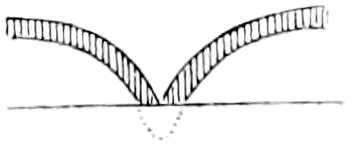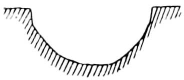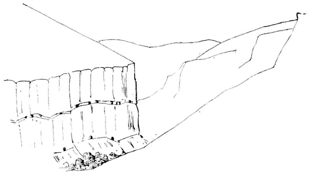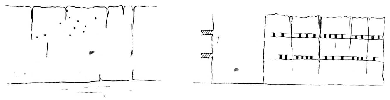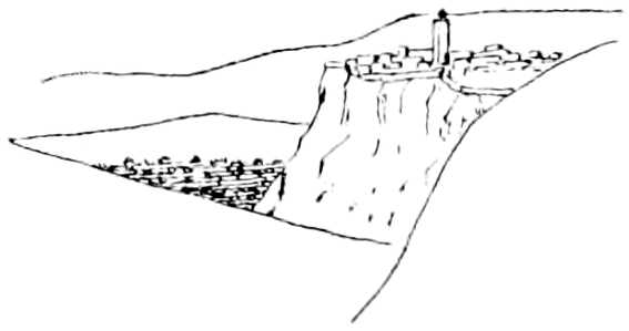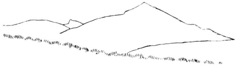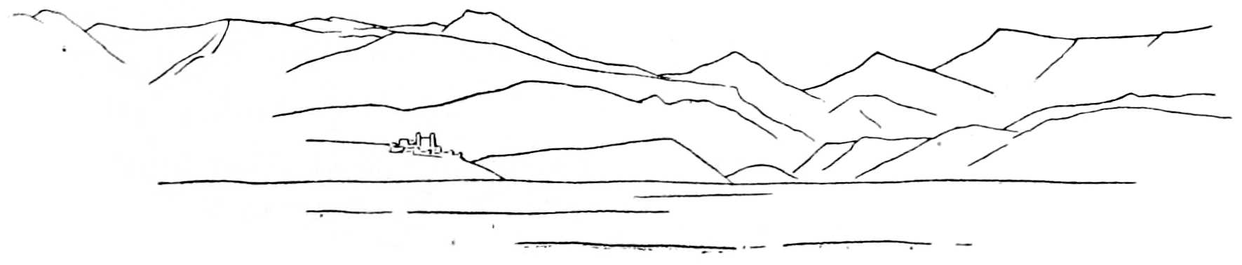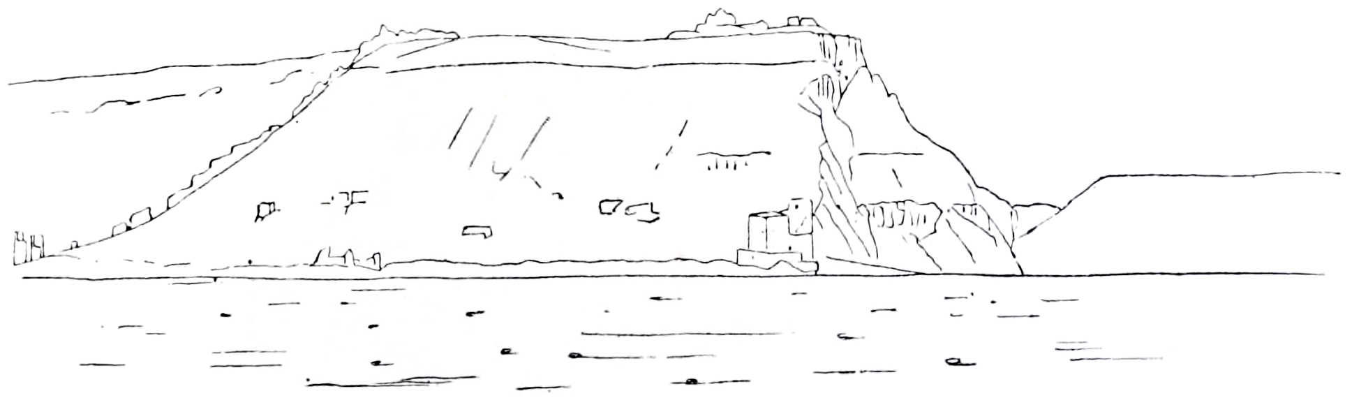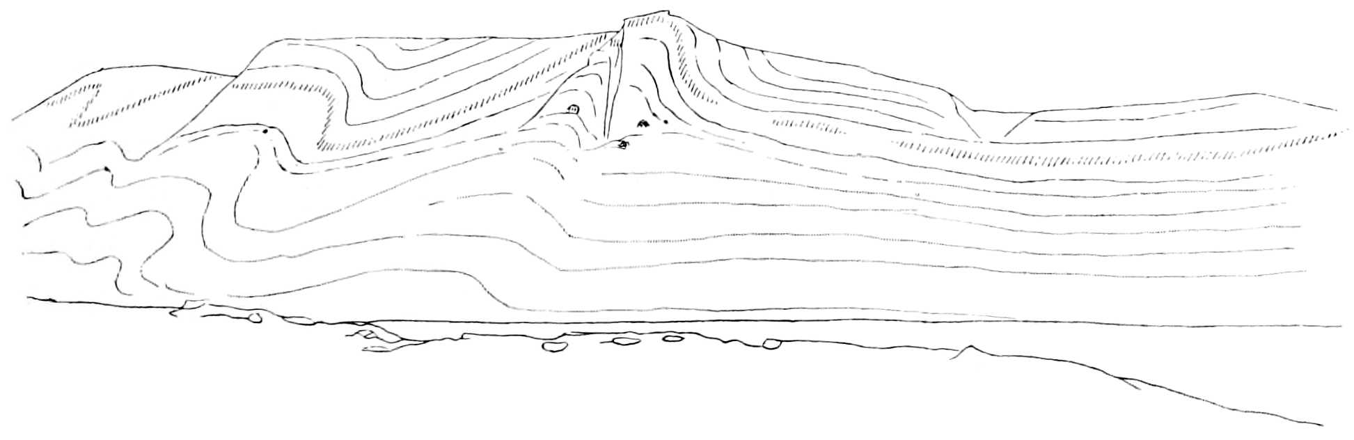 Toute la journée, il y avait des passants sur le chemin, dans les champs une foule de travailleurs. Ainsi que nous l’avons dit, la plupart des cultures consistent en blé ; cependant on rencontre aussi de l’orge et, de loin en loin, quelques champs de maïs. Deux cours d’eau importants : l’Ouad Tétouan (berges de terre presque à pic de 4 ou 5 mètres de haut ; lit de 12 mètres de large, rempli d’eau courante et assez claire, de 50 à 60 centimètres de profondeur ; fond de sable) ; et l’Ouad Meḥadjra (voici ce qu’il est dans sa partie inférieure : berges à peine marquées ; eaux vertes, de 6 à 8 mètres de large et de 30 ou 40 centimètres de profondeur, serpentant dans un lit de galets beaucoup plus large ; courant très rapide). Le Djebel Beni Ḥasan est un massif extrêmement remarquable : le versant occidental en affecte, dans sa partie nord, la forme suivante : α ; dans sa région sud, celle-ci : β ; les plus hauts sommets, dont les cartes marines nous donnent les altitudes, 1410 mètres, 2210 mètres, 1818 mètres, en sont invisibles du fond de la vallée ; une haute muraille de pierre grise, à crête dentelée, le couronne de ce côté et lui donne l’aspect le plus étrange : on dirait une série de rochers de Gibraltar juxtaposés sur un piédestal de montagnes : quelque chose comme ceci : γ. La crête supérieure de cette muraille me paraît être à une altitude à peu près uniforme pouvant varier entre 1200 et 1500 mètres. Au-dessus, quelques cultures entrevues en deux ou trois points semblent révéler l’existence d’un plateau.