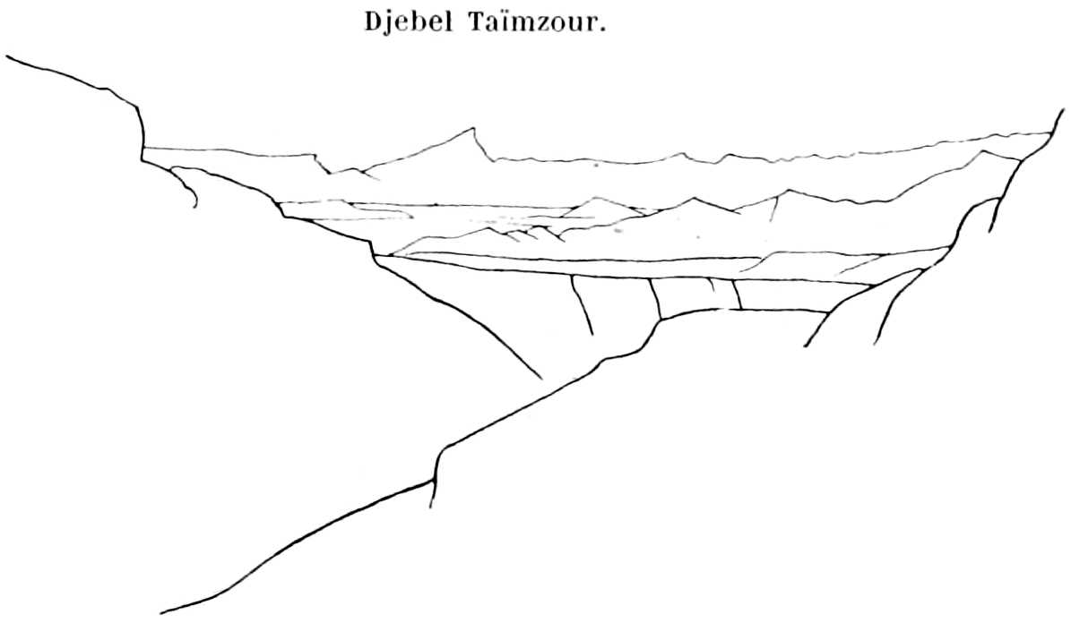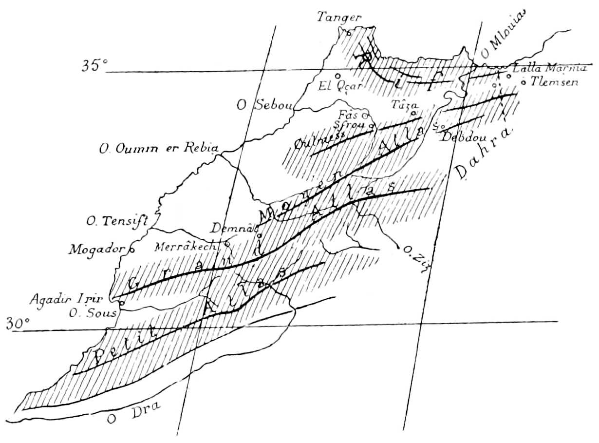 Mais à 50 kilomètres dans le nord, à 150 et à 200 kilomètres dans le sud, cette arête maîtresse est flanquée de chaînes parallèles dont le tracé sur la carte de M. de Foucauld est toute une révélation. Malgré le soin apporté par les géographes les plus habiles, aucun d’eux jusqu’ici n’avait trouvé dans les observations et les renseignements des voyageurs assez de données pour débrouiller ce qui était resté souvent un chaos, un enchevêtrement presque fantastique de sierras anastomosées. M. de Foucauld rectifie et simplifie tout cela d’après ce qu’il a vu et observé, et les géographes ne seront peut-être pas seuls à s’en réjouir, les géologues, eux aussi, en éprouveront de la satisfaction. Au nord de l’Atlas, court, nous le savons maintenant, une chaîne de 300 kilomètres, qui prend les noms de Djebel Aït Seri et de Djebel Benî Ouaghaïn ; au sud, c’est d’abord le petit Atlas, l’Anti-Atlas de la carte de Lenz, avec son prolongement oriental, le Djebel Sagherou, et enfin, encore plus au sud, le Djebel Bani, dont le rabbin Mardochée nous avait appris le nom, et que Lenz a coupé sans s’inquiéter de ce nom.
