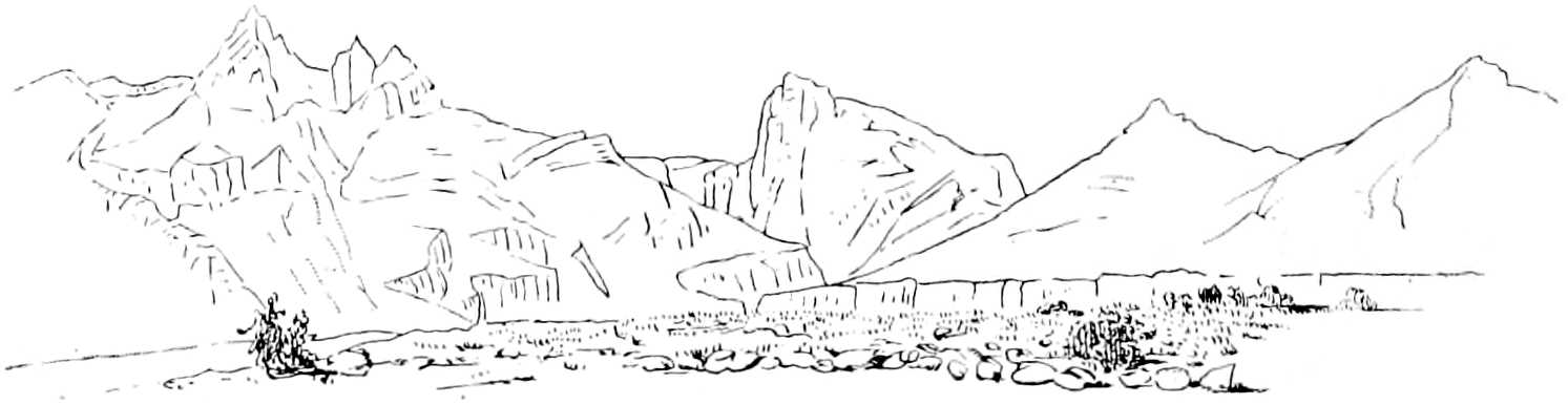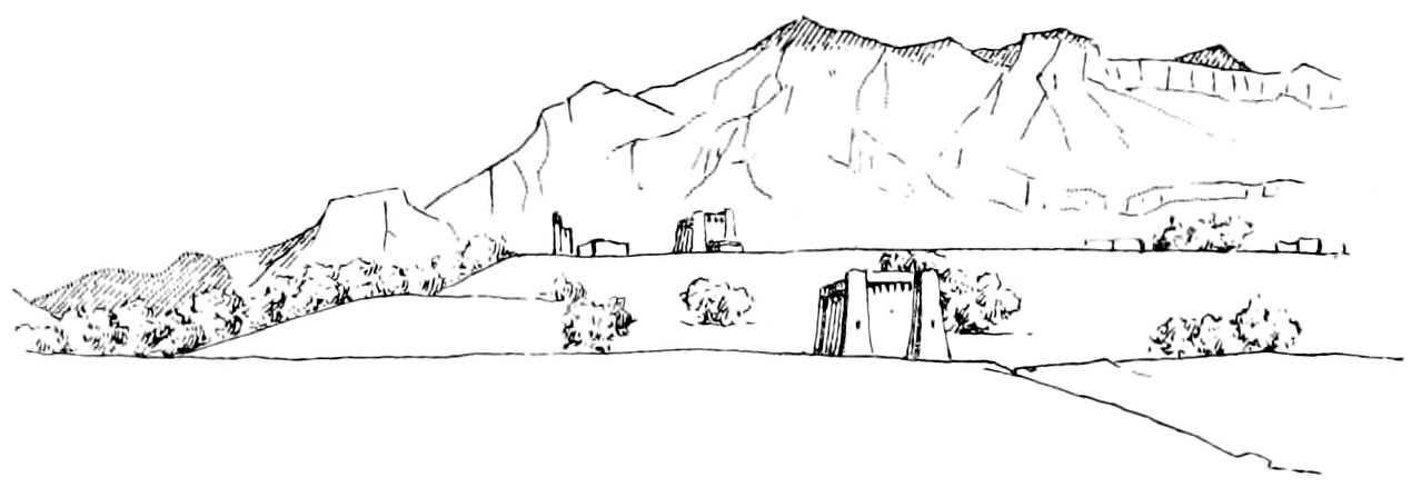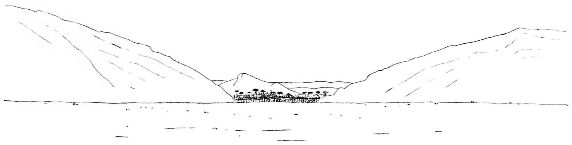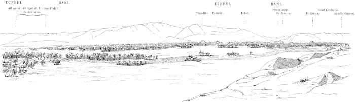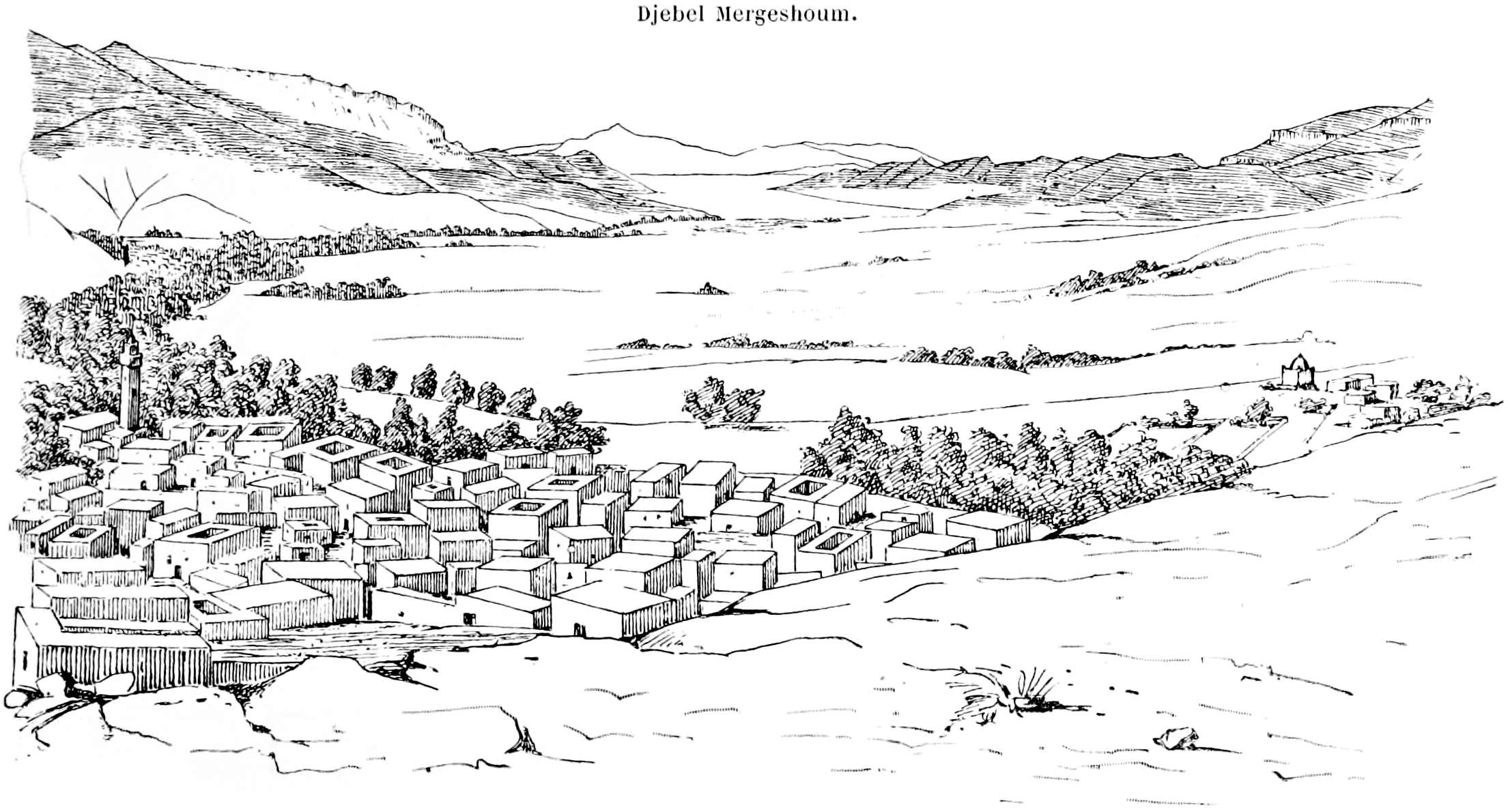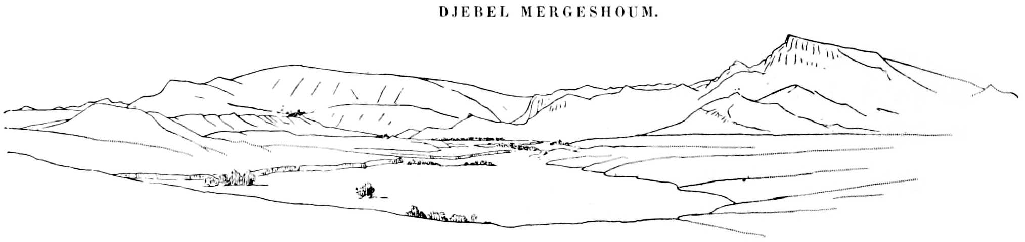 Durant toute la route le chemin est aisé. On est continuellement en montagne : par conséquent beaucoup de montées, beaucoup de descentes, un terrain généralement pierreux ; mais de passage difficile, point. Au début, dans la basse vallée de l’Ouad Meḥadjra, le pays a un aspect sauvage : la rivière est encaissée entre deux hauts[6] talus tout couverts de broussailles ; myrte, bruyère, palmiers nains, et surtout lentisques : au delà de ces talus on ne voit, à l’ouest, que de longues croupes boisées se succédant les unes aux autres ; à l’est, que la haute muraille rocheuse qui couronne le Djebel Beni Ḥasan. Cette dernière se dresse toute droite au-dessus de nos têtes : à peine se trouve-t-il entre elle et les lentisques une étroite bande de cultures : quant à l’ouad, c’est un torrent aux eaux vertes et impétueuses. Mais après quelque temps le paysage se modifie : la bande de cultures s’élargit ; des troupeaux paissent dans les broussailles ; on rencontre des villages. On marche encore : la rivière prend un autre nom : un palmier solitaire croissant sur sa rive la fait appeler Ouad en Nekhla. A ce moment s’opère un changement complet : lentisques et palmiers nains disparaissent : les talus s’arrondissant deviennent des côtes assez douces, que garnissent des cultures. Le Djebel Beni Ḥasan présente maintenant un aspect enchanteur : des champs de blé s’étagent en amphithéâtre sur son flanc et, depuis les roches qui le couronnent jusqu’au fond de la vallée, le couvrent d’un tapis d’or : au milieu des blés, brillent une multitude de villages entourés de jardins : ce n’est que vie, richesse, fraîcheur.