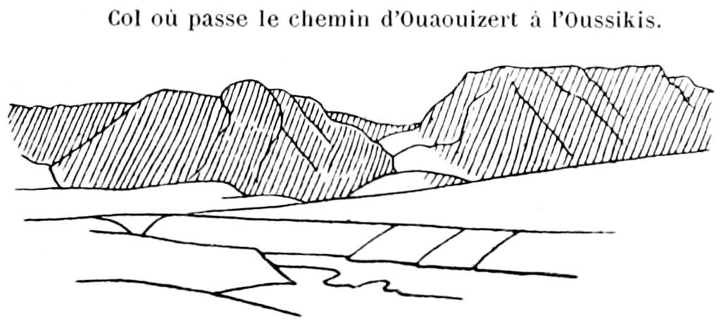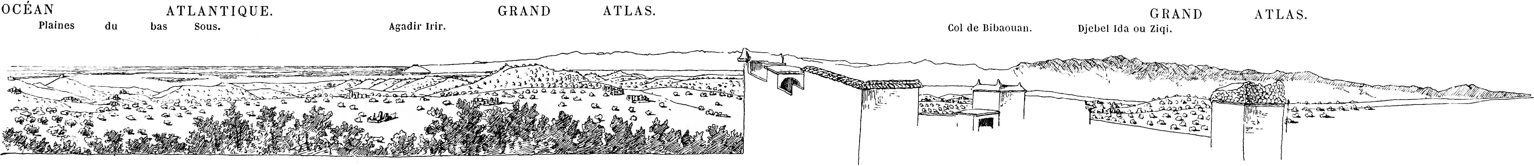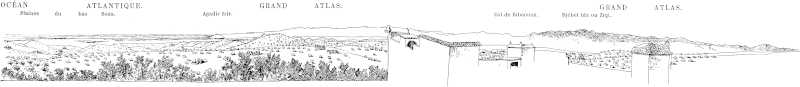 Nous arrivons à l’Adrâr-n-Deren, à la chaîne du seul véritable grand Atlas, et à ses contreforts. Quiconque[X] a jeté une fois seulement les yeux sur la carte d’Afrique a vu son attention éveillée par les forts coups d’estompe qui y accusent avec fermeté la chaîne de l’Atlas. Pour qui n’est pas bien au courant de l’histoire moderne de la géographie, la sûreté du dessin rassure l’esprit, et on se croit là en terrain à peu près sinon complètement connu. Il n’en est pourtant rien. De l’Iguîr Oufrâni, du cap Guîr de nos cartes, à la frontière de l’Algérie, le soulèvement du grand Atlas mesure, vous le savez, une longueur de 700 kilomètres. Eh bien, sur ce long développement de la chaîne, les itinéraires de tous les voyageurs européens n’avaient encore traversé et fixé que quatre cols, en comprenant le col qui touche au rivage de l’Océan : Tizînt El-Rioût, Tagherot, Onq El-Djemel et le col sur l’Iguîr Oufrâni (cap Guîr). Après René Caillié et Gérard Rohlfs, M. le vicomte de Foucauld, lui aussi, a passé par le Tizînt El-Rioût ; il est le premier explorateur qui ait franchi et mesuré le Tîzi-n-Guelâwi, à l’est-sud-est de Merâkech. Ses observations du baromètre nous apportent donc les altitudes de deux cols dans l’arête maîtresse de l’Atlas ; ces chiffres sont les premiers que nous possédions, ni Rohlfs ni Lenz, qui avaient pourtant des baromètres, n’ayant fait d’observations sur les points culminants de leurs deux itinéraires dans le Maroc. De plus, sur une longueur de 300 kilomètres au moins, les itinéraires de M. le vicomte de Foucauld passent à une distance de l’Atlas qui permettait de déterminer sur la carte la direction de la chaîne.