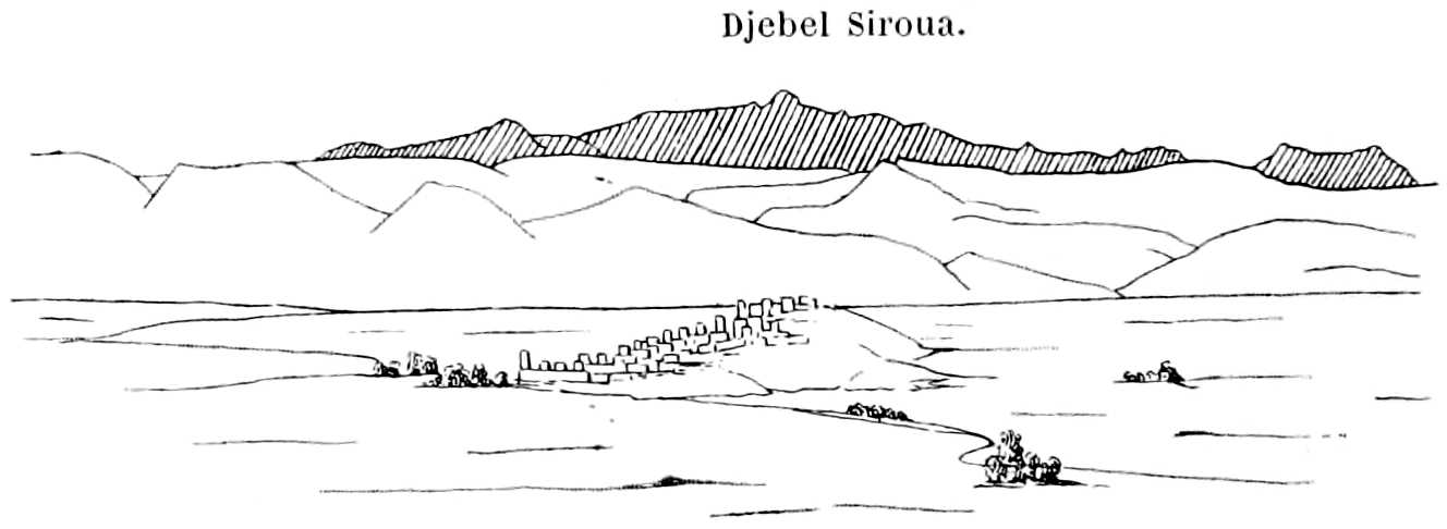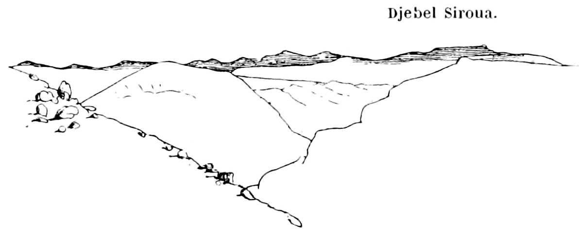 A 4 heures du matin on se remet en marche. Nous ne tardons pas à entrer[3] dans la montagne. Nous nous élevons d’abord par des pentes douces couvertes de bois ou de broussailles ; ce sont surtout des oliviers et des lentisques ; beaucoup de gibier : lièvres, perdreaux, tourterelles. A partir d’un fondoq[5] devant lequel nous passons, le terrain change : le sol devient rocheux, les côtes raides, le chemin difficile ; les arbres s’éclaircissent et sont remplacés par le myrte et la bruyère. A 6 heures et demie, nous atteignons le col.