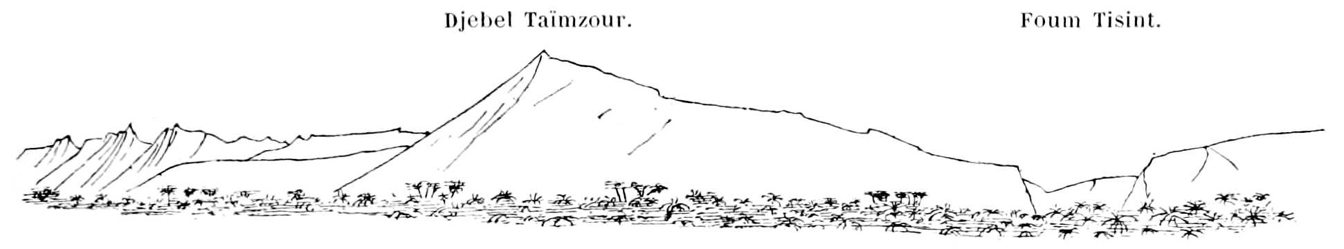 Un peu au sud et au nord du 30e degré de latitude, l’arête du petit Atlas marque une division tranchée. Au nord de cette chaîne, nous apprend M. de Foucauld, on est encore dans la zone tempérée ; la flore dans ses traits généraux rappelle celle du midi de l’Europe. Le versant sud du petit Atlas est déjà dans la zone saharienne caractérisée par un climat à extrêmes. Ici, le dattier et les acacias à gomme remplacent le figuier, l’amandier, le grenadier, l’olivier et même le noyer du versant septentrional et de la région plus au nord. Le dattier, il est vrai, cet arbre cultivé, n’existe que dans les vallées que la fonte des neiges et les pluies de l’Atlas viennent mouiller de temps en temps ; l’acacia à gomme se trouve de loin en loin sur les plaines d’un sable blanc. Quant à l’eau, on est réduit à celle de sources cachées sous le sable.