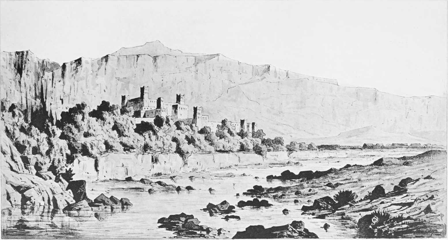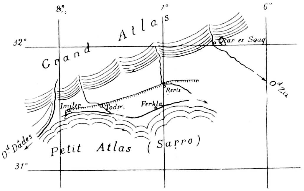 Toujours en terrain neuf, M. de Foucauld continue sa route sur Todegha, Ferkela et Gherîs, trois oasis qui, dans son langage imagé, « s’allongent comme trois tronçons de serpent » dans les lits de cours d’eau affluents du Zîz. Il entre donc là dans le bassin hydrographique à l’extrémité sud duquel s’épanouit le Tafîlelt, le berceau de la dynastie marocaine régnante, le lieu d’exil pour ceux de la famille impériale qui pourraient devenir des prétendants, le groupe d’oasis célèbre, dans une vaste partie de l’Afrique, pour les cuirs qu’on y prépare avec une grande perfection.