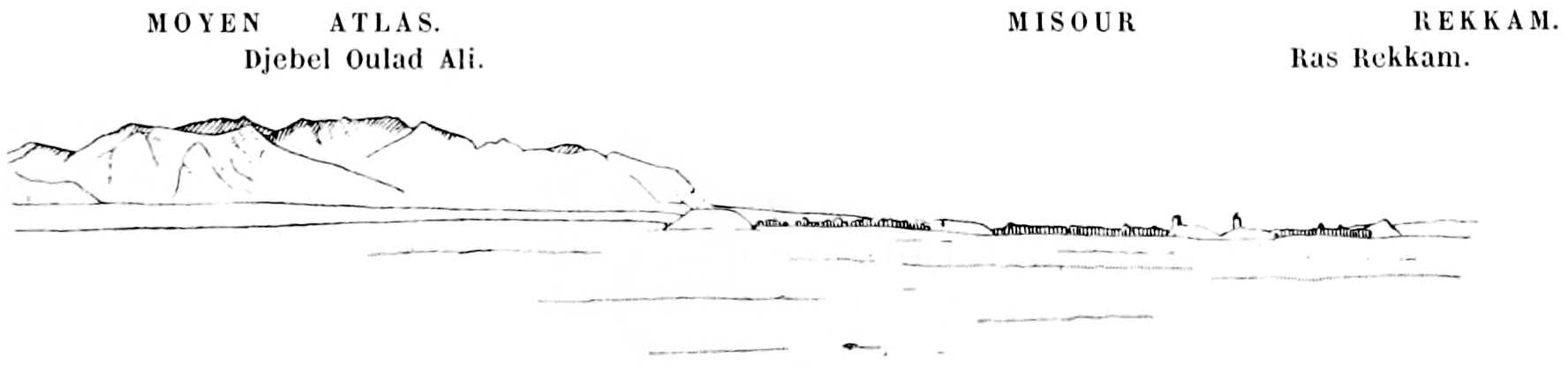 Mais à Meknâs précisément commence une des parties les plus nouvelles et les plus intéressantes du voyage de M. de Foucauld ; de là jusqu’à près de cinq degrés plus au sud, son itinéraire est à proprement parler celui d’un voyage de découverte dans la province de Tâdela (ici déjà l’expression administrative est illusoire), et plus au sud, dans le territoire parfaitement indépendant des Berbères. Pour rester fidèle à notre programme, nous considérerons maintenant le pays jusqu’à Qaçba Beni-Mellâl (aussi nommée Qaçba-Bel-Kouch), où commencent les premiers plis du soulèvement de l’Atlas. Il se présente d’abord avec une surface accidentée, puis il devient montagneux et ici les montagnes sont boisées. A 20 kilomètres de Boû-El-Dja’d, le voyageur entre dans la plaine pierreuse et aride de Tâdela, qui s’étend au sud, montrant des signes de fertilité quand on se rapproche de l’Ouâd Oumm Er-Rebîa’, sur lequel est bâtie la Qaçba de Tâdela, à l’intérieur des murs de laquelle le sultan est obéi par un qâïd si désœuvré, par suite de l’insoumission de ses prétendus administrés, qu’il passe ses journées à réciter son chapelet. Entre la Qaçba de Tâdela et la Qaçba Bel Koûch, ou Qaçba Benî Mellâl, bâtie au pied d’une première chaîne dépendant de l’Atlas, on passe dans un pays bien arrosé, couvert de cultures, de jardins et de villages. — Toute cette partie du voyage est entièrement nouvelle.