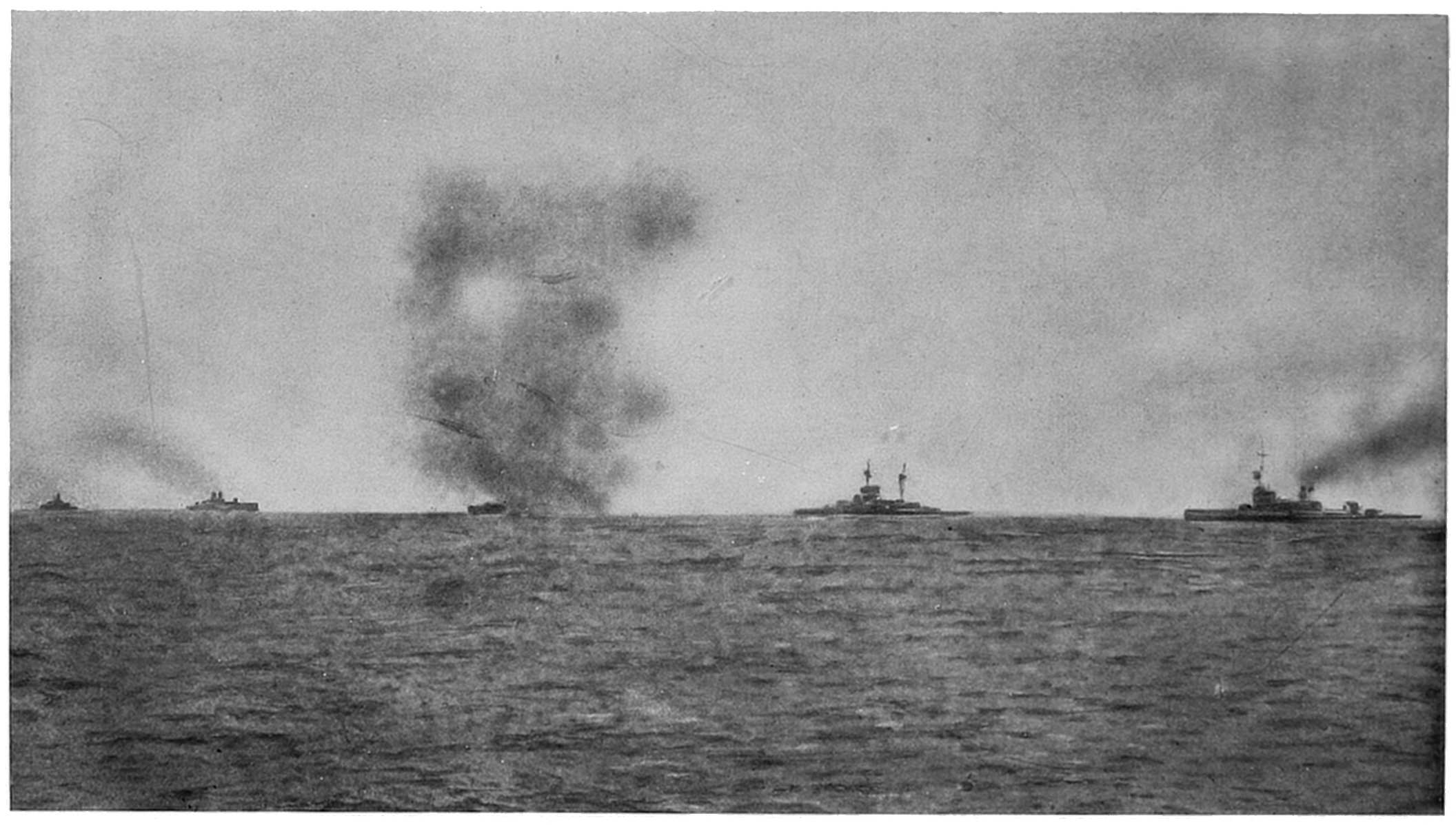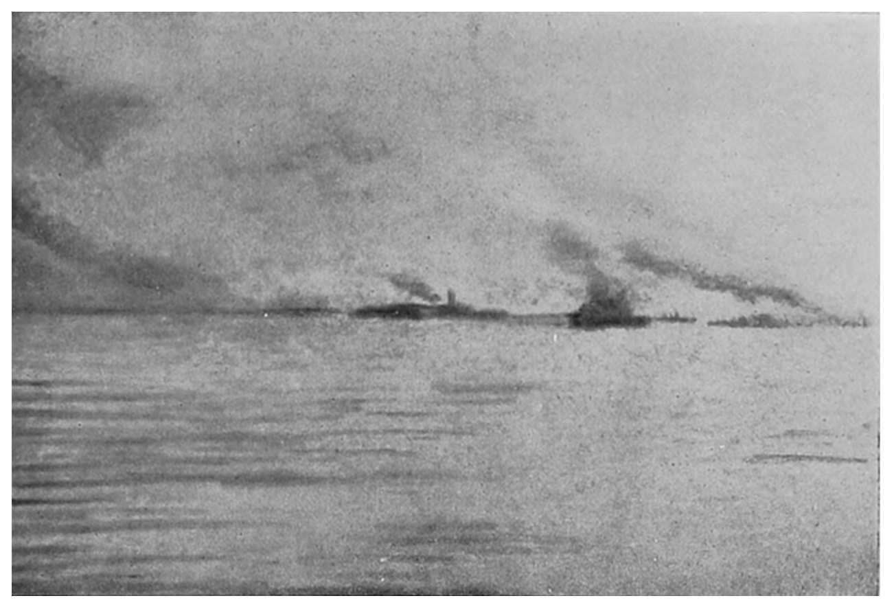 The enemy’s destroyers emitted vast columns of smoke to screen their battle cruisers, and under cover of this the latter now appeared to have altered course to the northward to increase their distance, and certainly the rear ships hauled out on the port quarter of their leader, thereby increasing their distance from our line. The battle cruisers, therefore, were ordered to form a line of bearing N.N.W., and proceed at their utmost speed.
