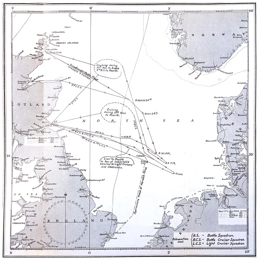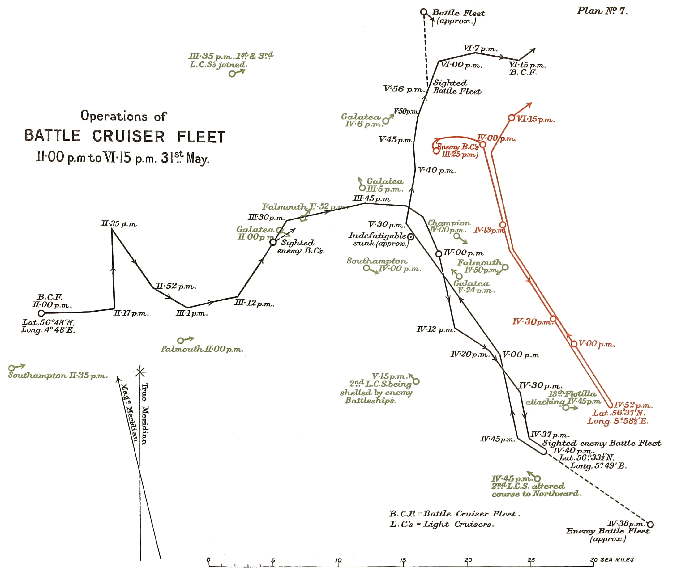 The courses of our Battle Cruisers are taken from the report of the Vice-Admiral Battle Cruiser Fleet and from the Lion and Indomitable.