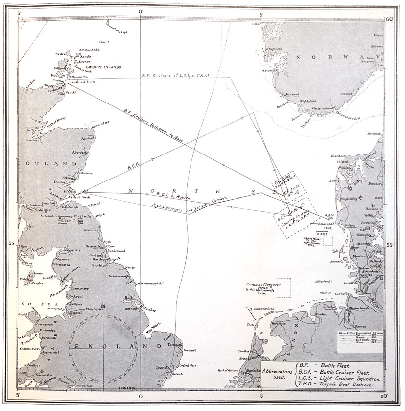 The Battle Cruisers Lion, Captain Alfred E. M. Chatfield, C.V.O., flying my flag; Princess Royal, Captain Osmond de B. Brock, Aide-de-Camp; Tiger, Captain Henry B. Pelly, M.V.O.; New Zealand, Captain Lionel Halsey, C.M.G., Aide-de-Camp, flying the flag of Rear-Admiral Sir Archibald Moore, K.C.B., C.V.O.; and Indomitable, Captain Francis W. Kennedy.