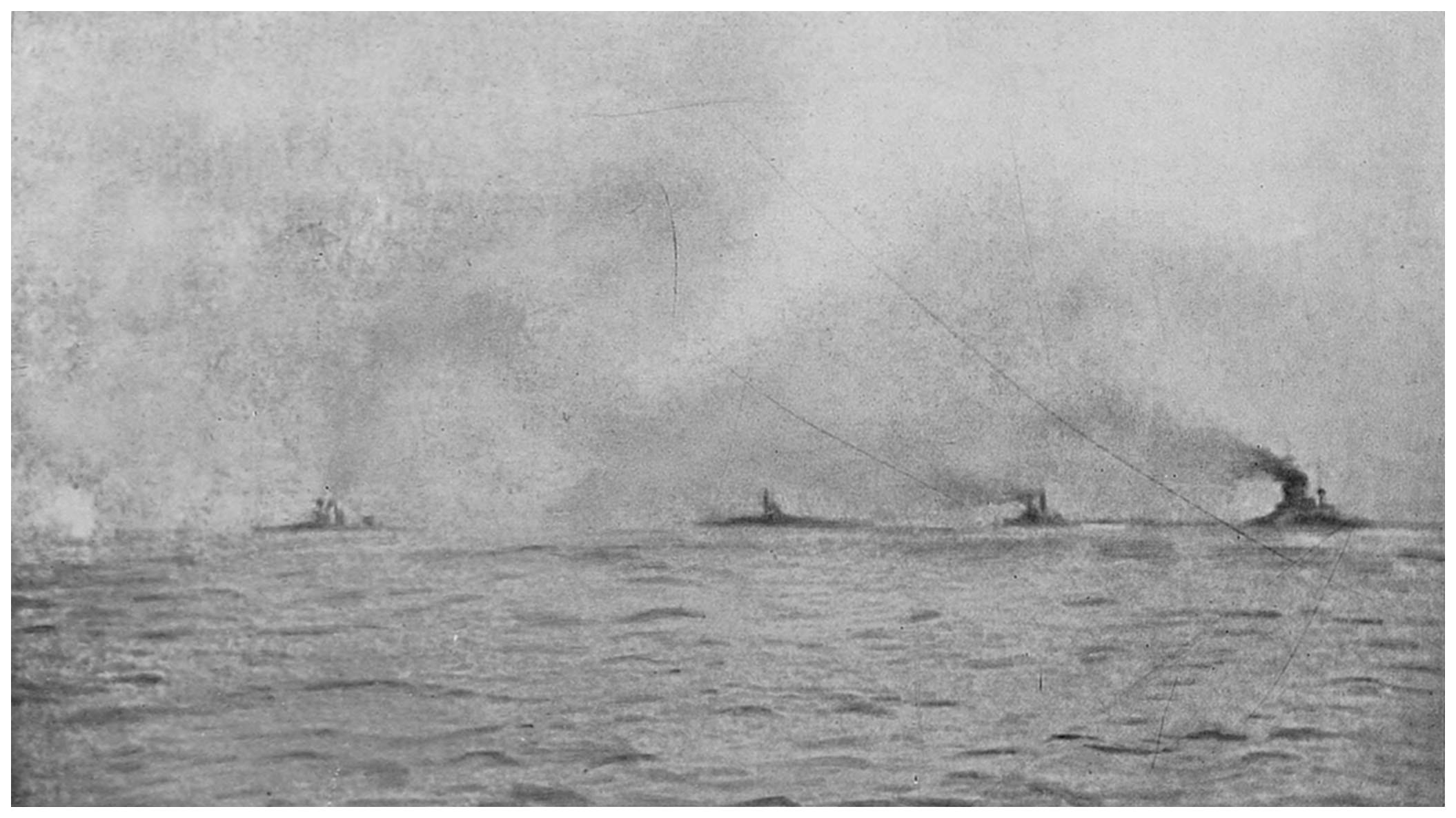 Our flotilla cruisers and destroyers had gradually dropped from a position broad on our beam to our port quarter, so as not to foul our range with their smoke; but the enemy’s destroyers threatening attack,492 the Meteor and “M” Division passed ahead of us, Captain the Hon. H. Meade, D.S.O., handling this Division with conspicuous ability.