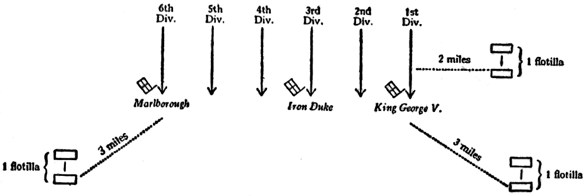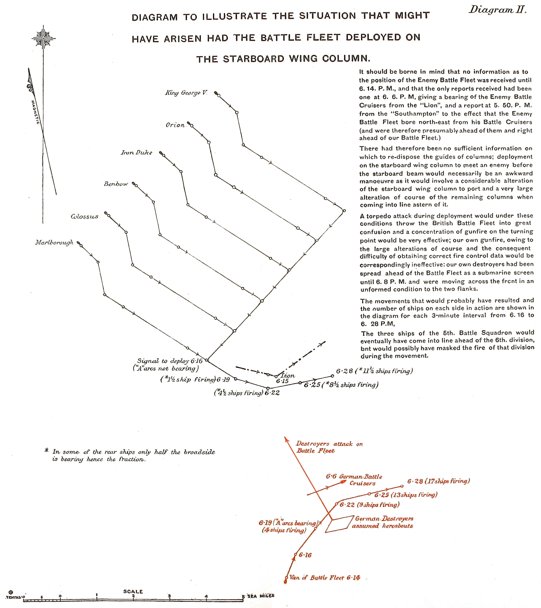 A torpedo attack during deployment would under these conditions throw the British Battle Fleet into great confusion and a concentration of gunfire on the turning point would be very effective; our own gunfire, owing to the large alterations of course and the consequent difficulty of obtaining correct fire control data would be correspondingly ineffective: our own destroyers had been spread ahead of the Battle Fleet as a submarine screen until 6.8 P.M. and were moving across the front in an unformed condition to the two flanks.