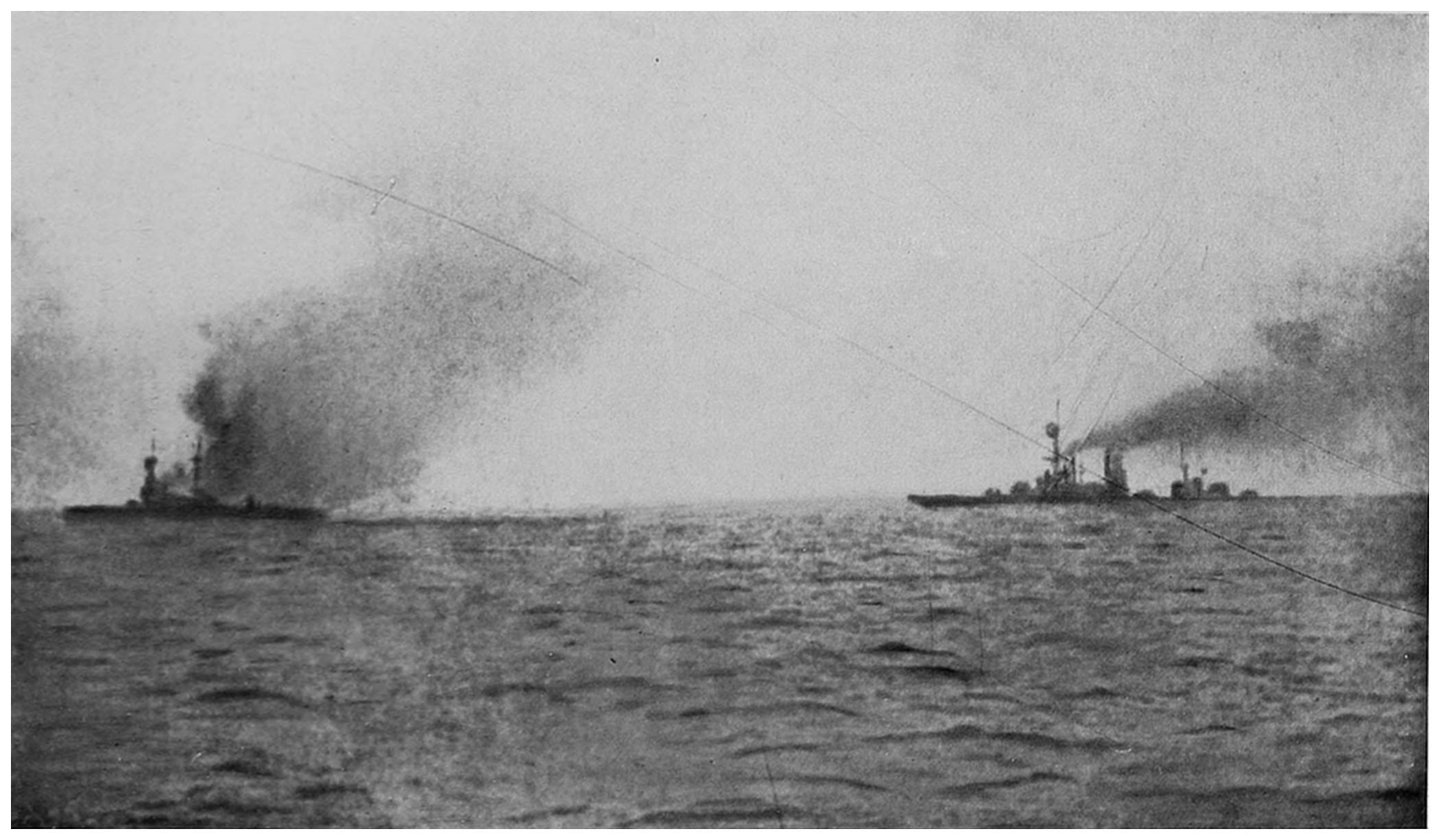 At 8.52 A.M., as we had closed to within 20,000 yards of the rear ship, the Battle Cruisers manœuvred to keep on a line of bearing so that guns would bear, and Lion fired a single shot, which fell short. The enemy at this time were in single line ahead, with Light Cruisers ahead and a large number of Destroyers on their starboard beam.