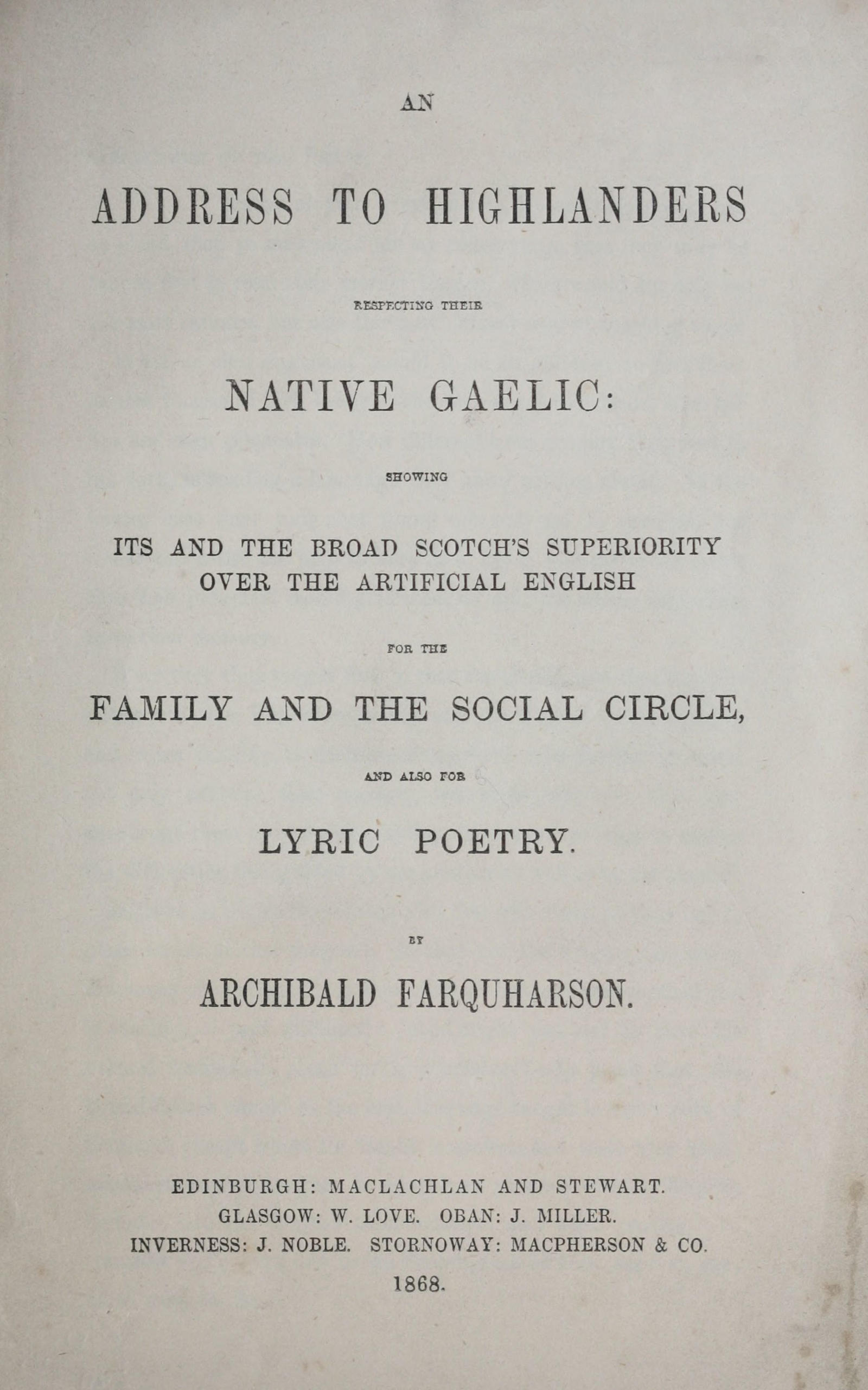 Although my native country, I am quite ashamed of them. Is the schoolmaster a Highlander? Was it he who wrote the inscription “Mile failte” (a thousand welcomes) on the top of the arch on the occasion of a certain gentleman up the country taking home his English bride? I passed under it, and expressed my astonishment to see it, as the children spoke nothing but English on the street. Is the spark still alive in his soul? Is that spark capable of being enkindled into a flame? A thraill! Na’m bithinn ann ad ait, bheirinn oidhearp air mo chainnt-mhathaireil a theasairginn, ged a bhiodh i mar an t-uan ann am fiaclan casgraidh an leomhainn. Ye slave! Were I in your place, I would endeavour to rescue my mother-tongue, should it be like the lamb in the devouring teeth of the lion.