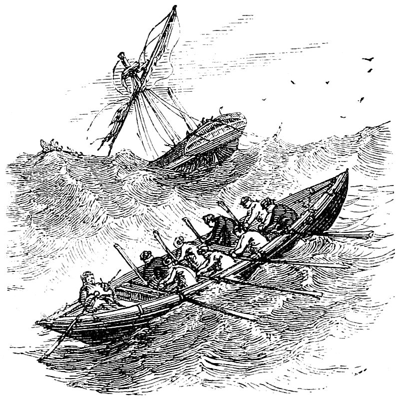 Nineteen persons had entered the port cutter. These consisted of the second and third engineers, one fireman, the boatswain’s mate, the quartermaster, the carpenter’s mate, the steward, the boatswain’s boy, five able seamen, and three passengers. They had received their course from the now drowned Captain—N.N.E. to Brest, which was 190 miles distant, and they had compasses on board. Under the direction of King, the men agreed, that whatever might happen they would sit immoveable, except when pulling at the oars. Two worked at each oar, and they ran before the sea. Both Daniell and King deserve the highest praise for their skill in steering the feeble craft over the raging waters, but it was pleasant to find them both modest and seamanlike in all they said about it.